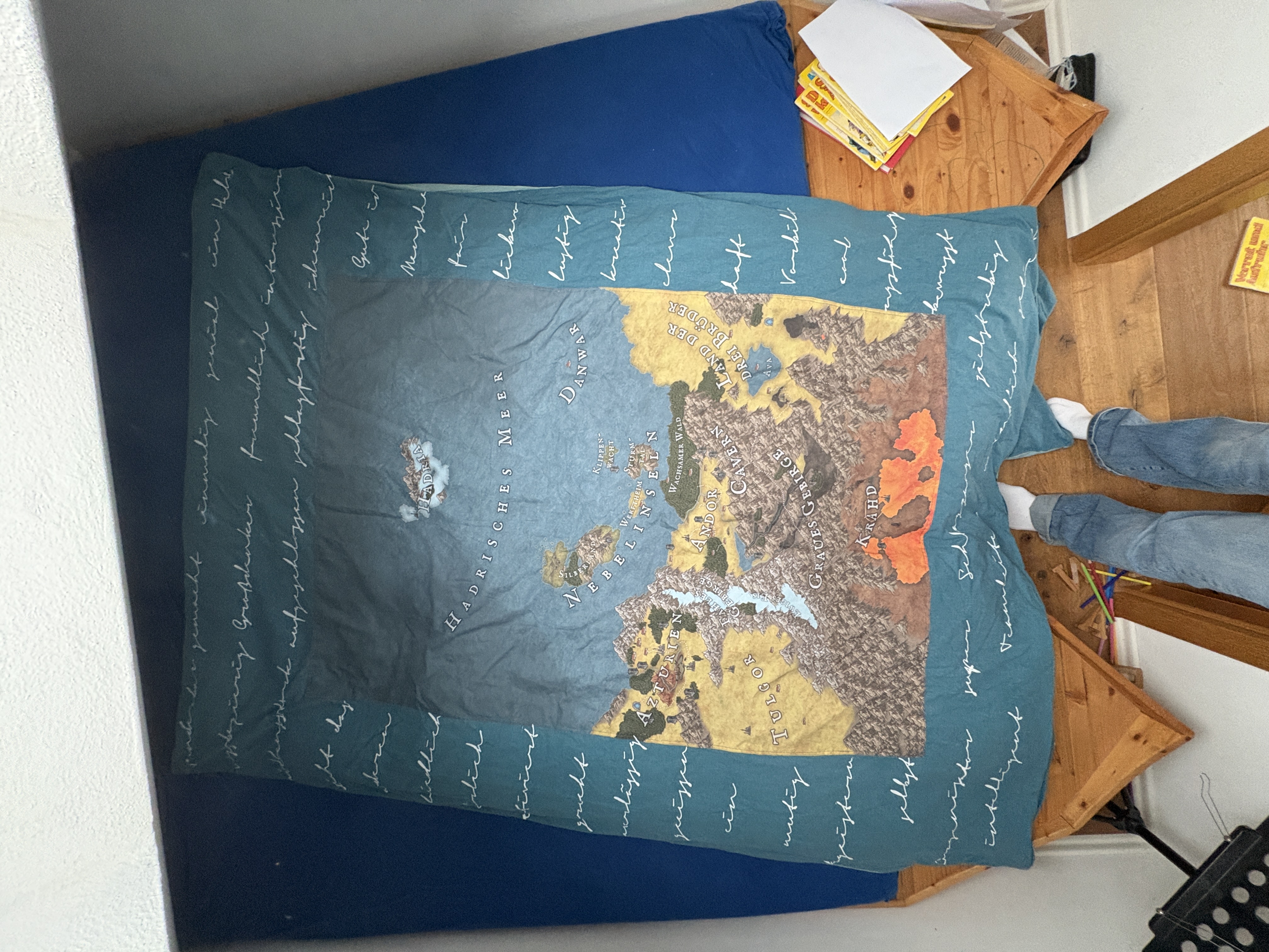 Ich war davor Abende lang am überlegen und versuchen, wie ich diese Landkarte gut auf diese Bettdecke bekomme. Habe schon einen Beamer ausgeliehen und installiert, um mir eine Vorlage zu projizieren. Das wäre aber nicht so gut gewesen:-)