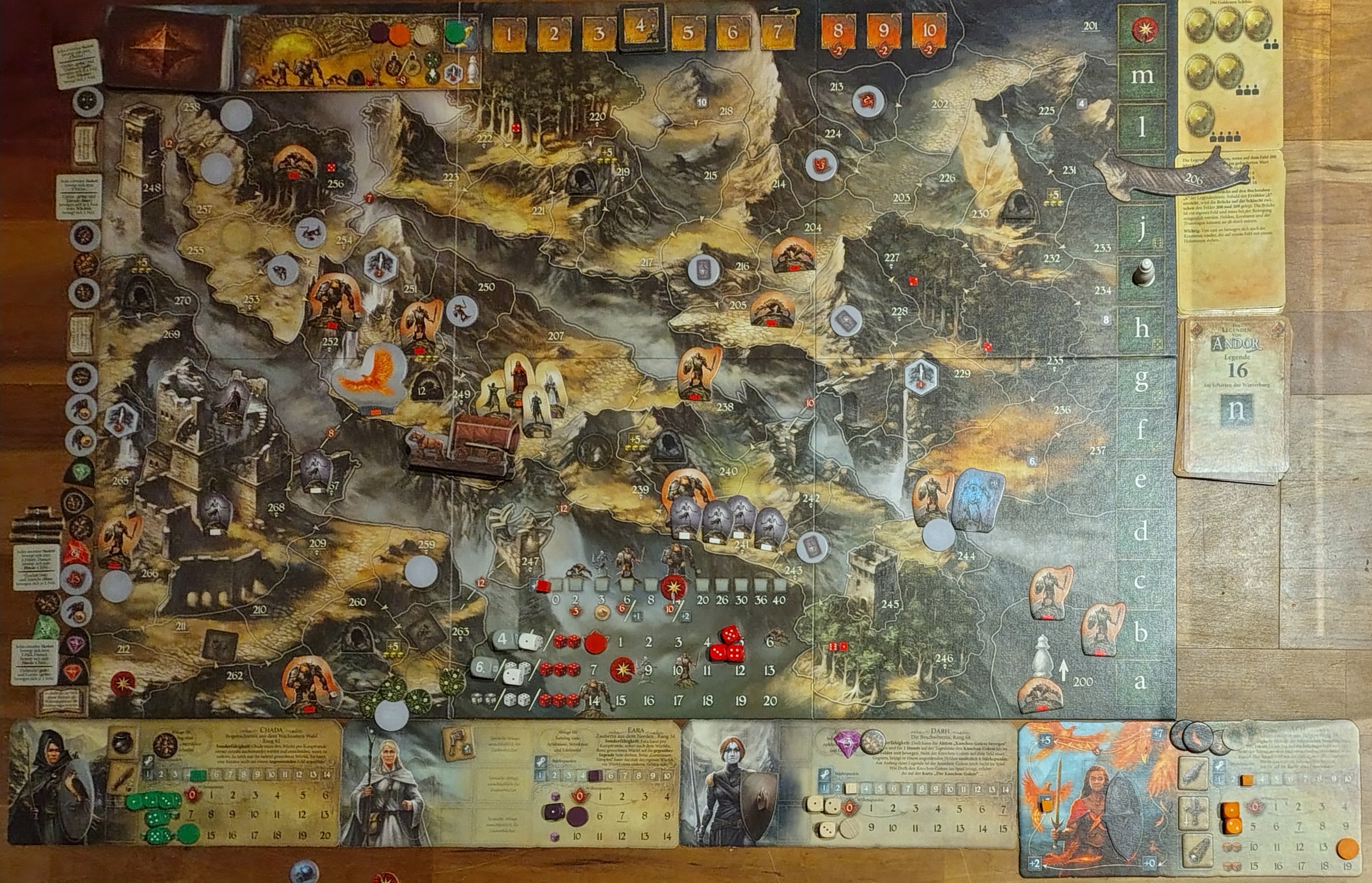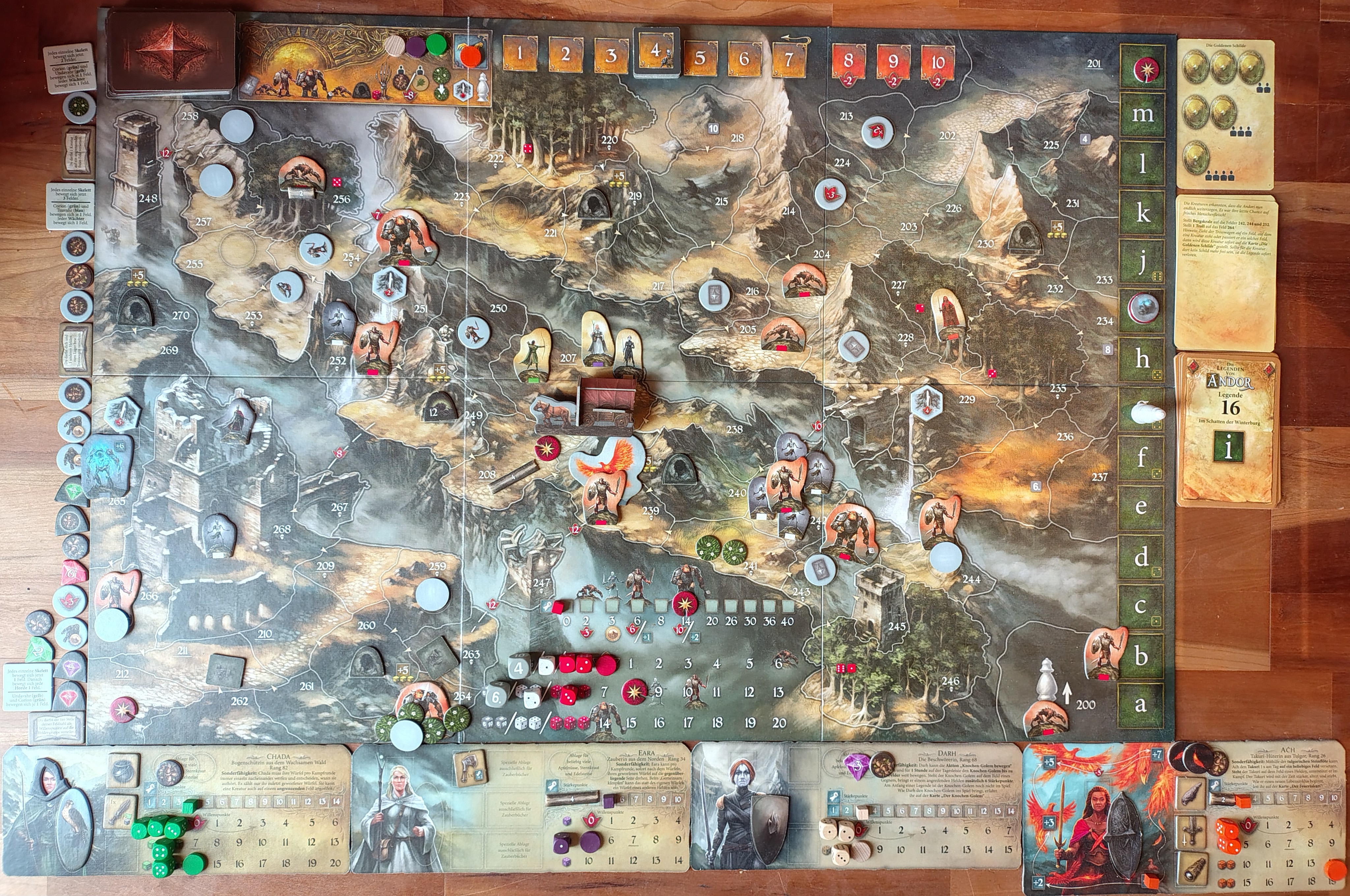 Chada schießt auf den Bergskral, Eara, Darh und Turr unterstützen. Chada lässt Pfeile niederregnen, alle meilenweit daneben. Schließlich hat Eara Mitleid und lenkt einen Pfeil ins Ziel: 4, 1, 2, 1, 1 -> 6. Eara hat ihre magische Energie nun natürlich für Chada aufgebraucht: 1. Auch Darh erbringt keine Bestleistung: 1, 3, 4 -> Kampfwert 29 Aber auch der Bergskral ist nicht in Form: 1, 2, 4 -> Kampfwert 10. Sieg in einer Kampfrunde (2.h + 2.h + 2.h)