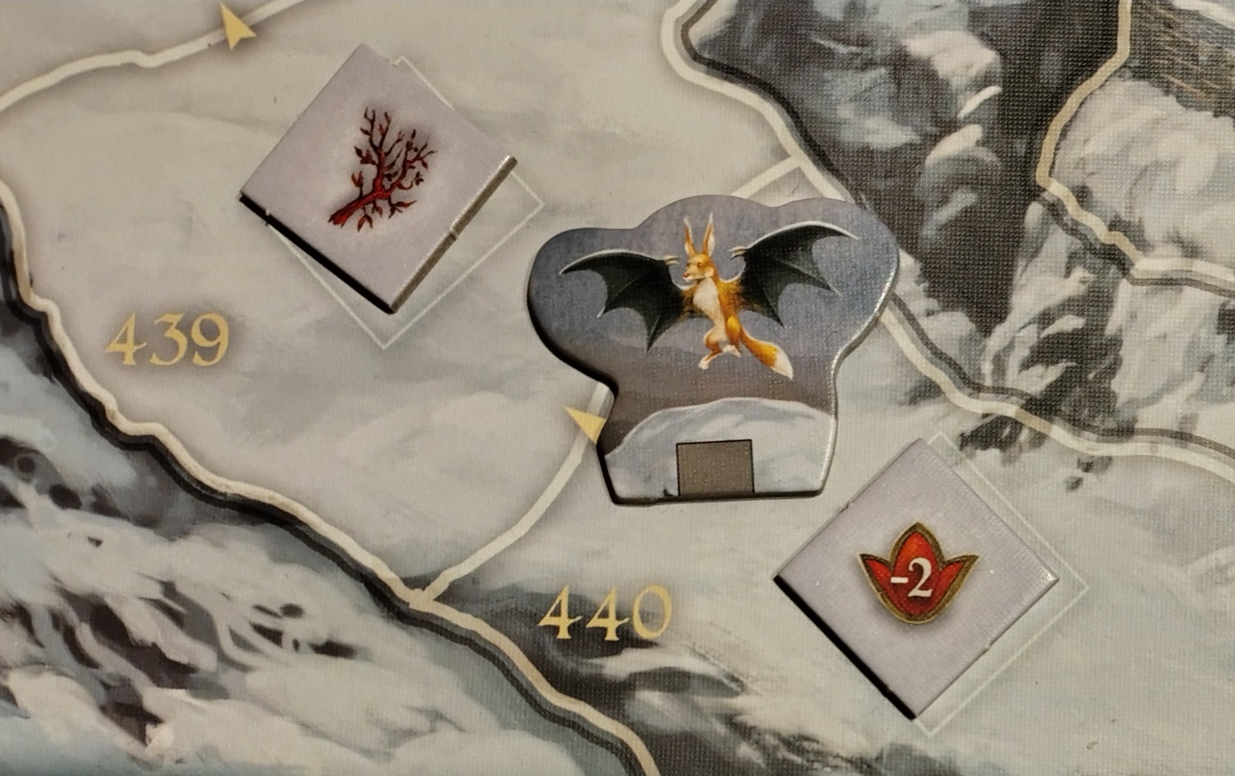 Es sind Zielmarker bei den Grehon, auf auf Feld 438 und in der Pfahlbausiedlung. Wenn wir so ein Feld betreten, wird eine Karte vorgelesen. Der Zielmarker wird dann wie ein Kraut eingesammelt und kann auch mit dem Falken verschickt werden. Wenn ein Held alle drei hat, wieder die Karte „Die Erkenntnis“ vorgelesen.
