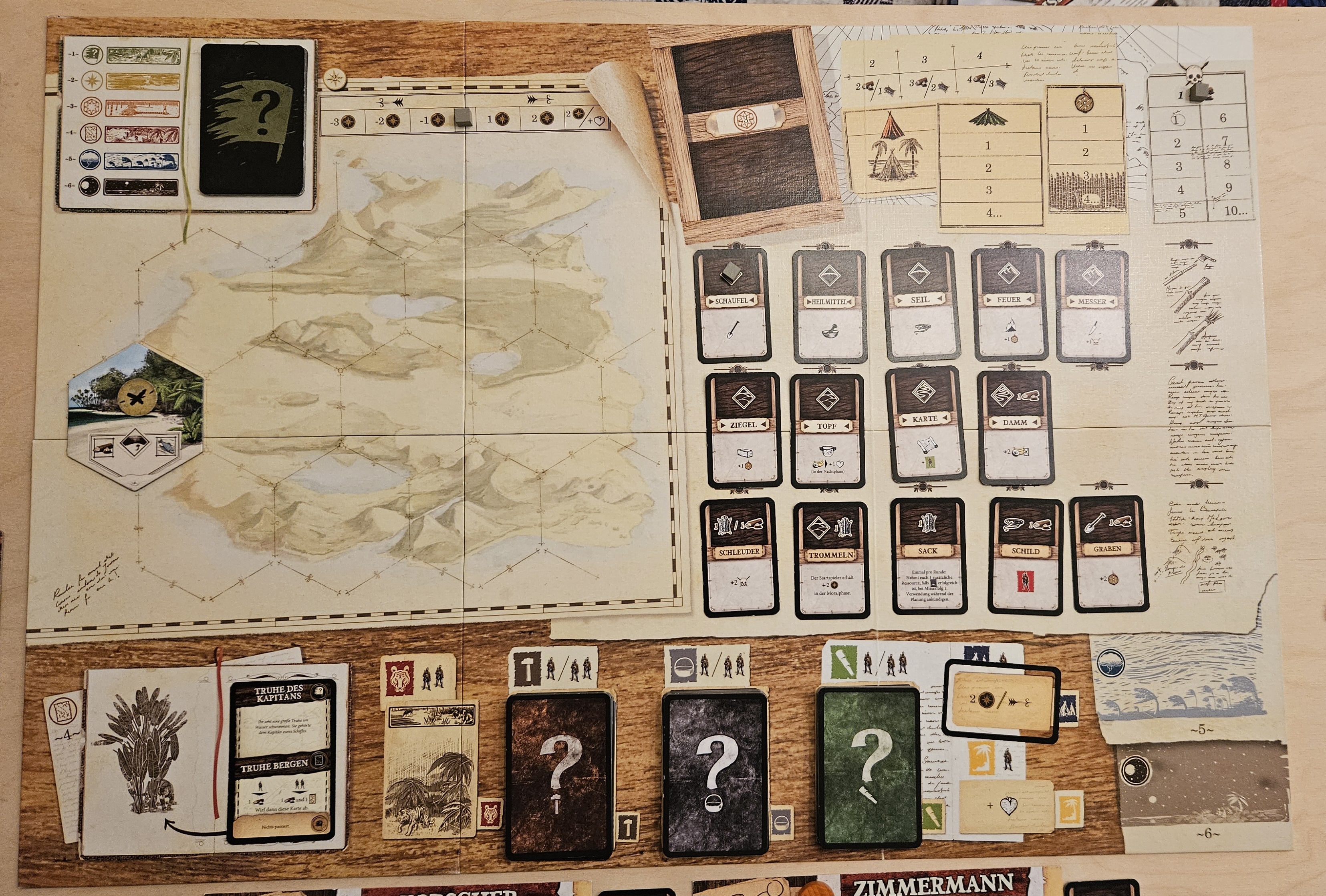 Zusätzlich würde ich jetzt eine neue Erweiterung dazunehmen. Dabei handelt es sich um den "Ausgebauten Unterschlupf" (die großen Plättchen unterhalb der Szenariotafel)
