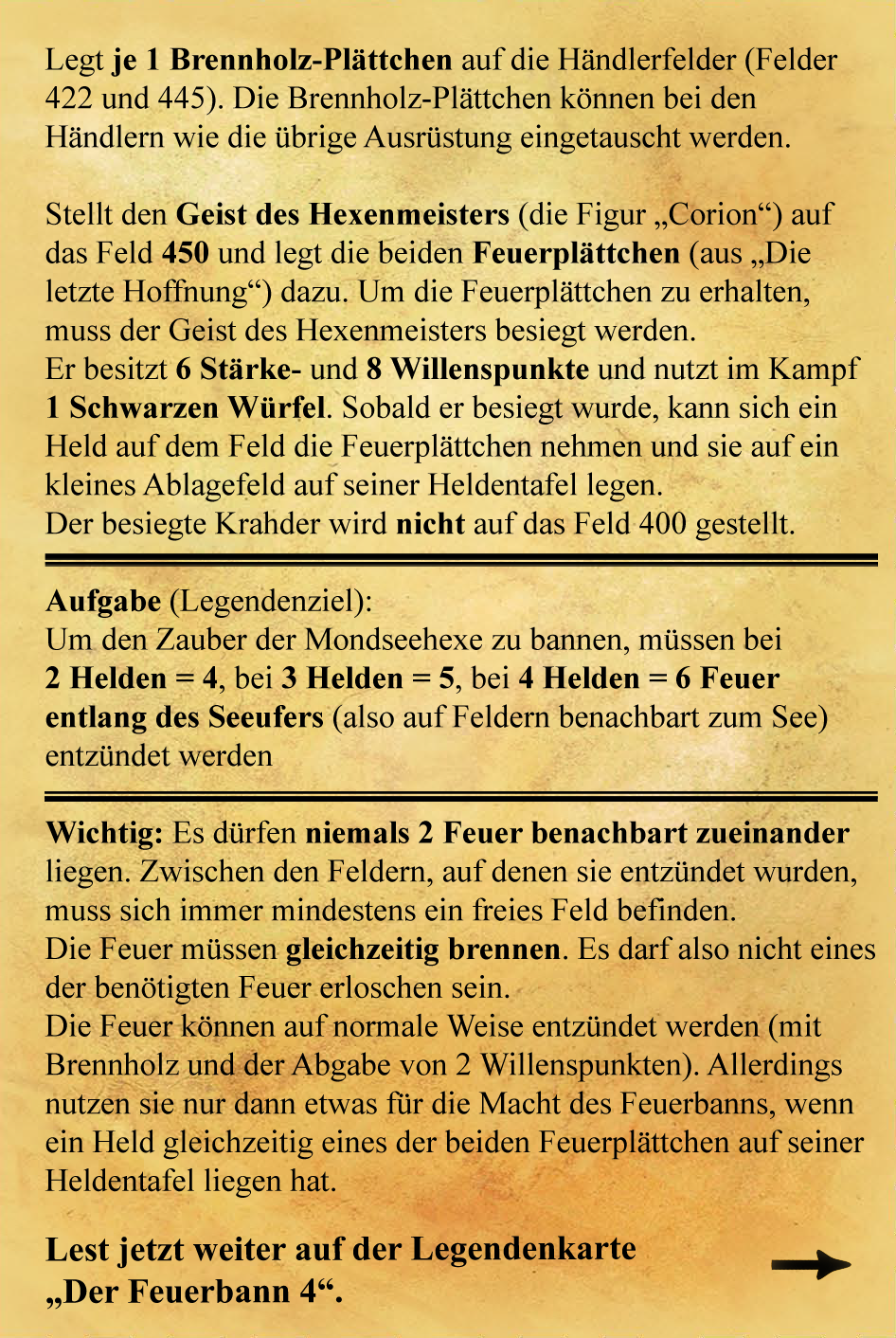 "Haben die Helden mit Hilfe der Feuerplättchen die benötigte Anzahl Feuer auf Feldern benachbart zum Großen See entzündet, wird der Erzähler auf den Buchstaben N vorgesetzt."