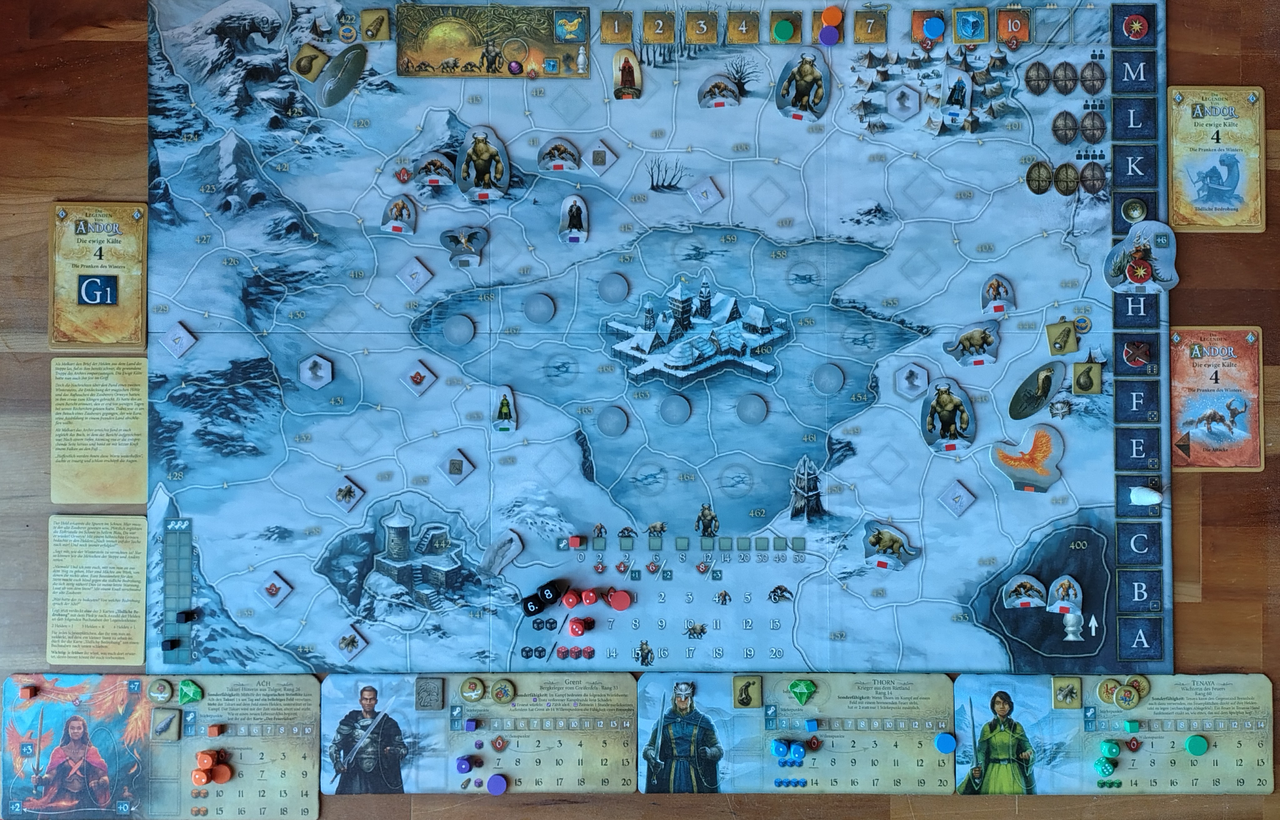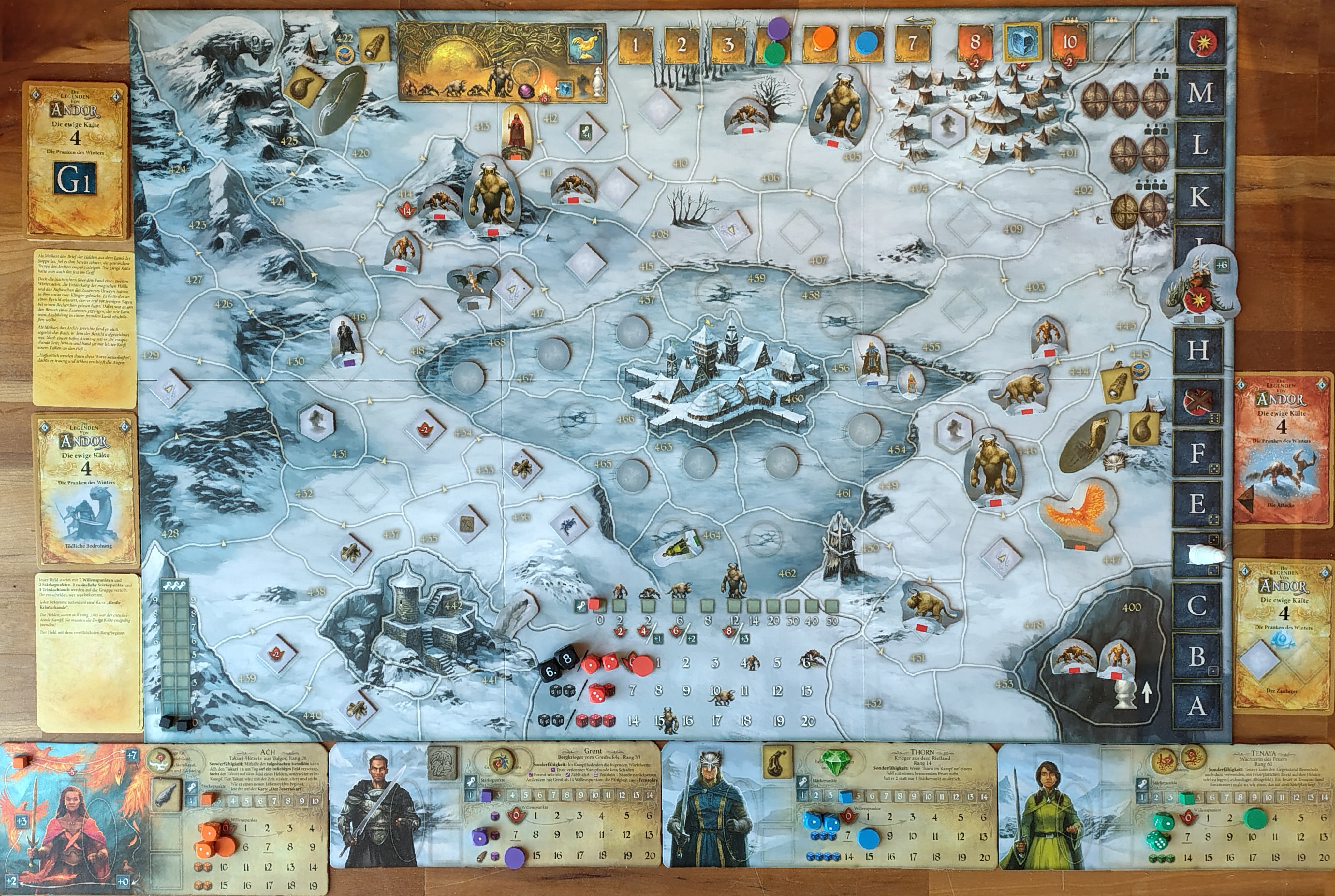 Wenn wir ab jetzt ein Schneeplättchen mit Sternchen aufdecken, wandert die Legendenkarte ein Feld nach unten. Ein Tipp weißt uns darauf hin, dass wir uns besser auf die Bedrohung vorbereiten können, je eher wir wissen, was uns dort erwartet.