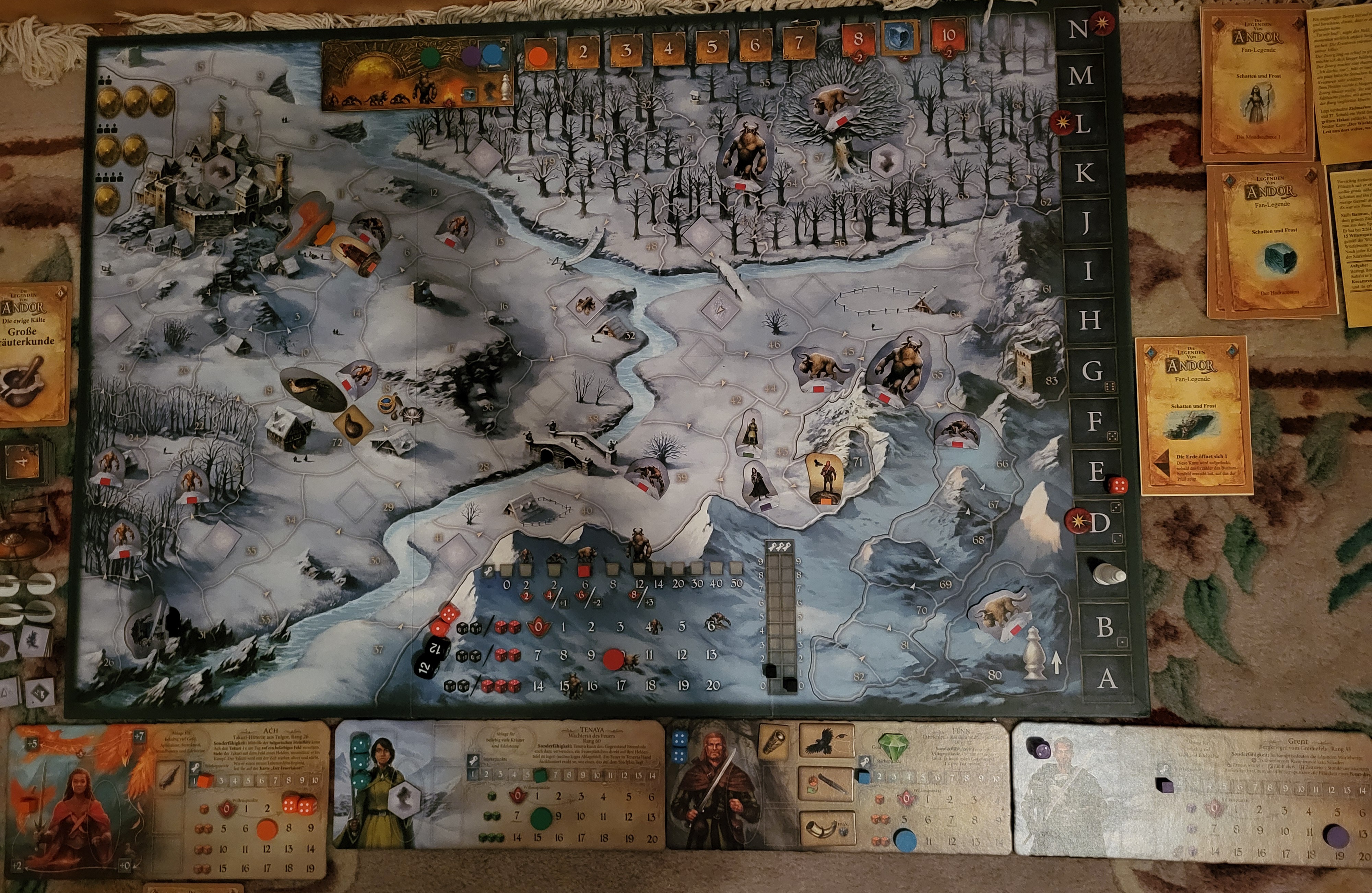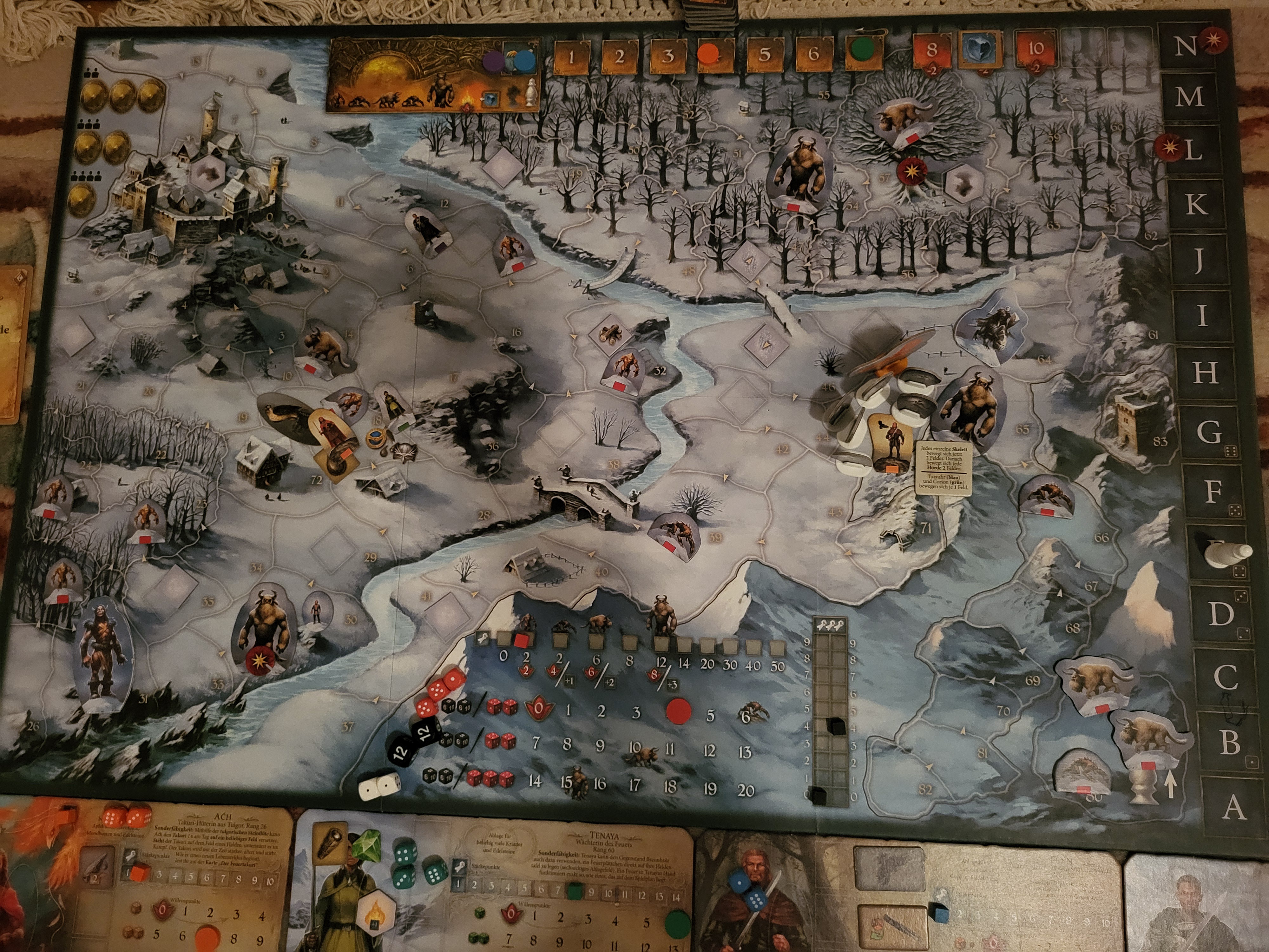 Erwürfelt die Positionen der Skelette und des Schattenkönigs indem ihr mit einem roten Würfel würfelt und 60 addiert. Skelette und der Schattenkönig bewegen sich nach den üblichen Regeln aus „Die letzte Hoffnung“ und halten Helden