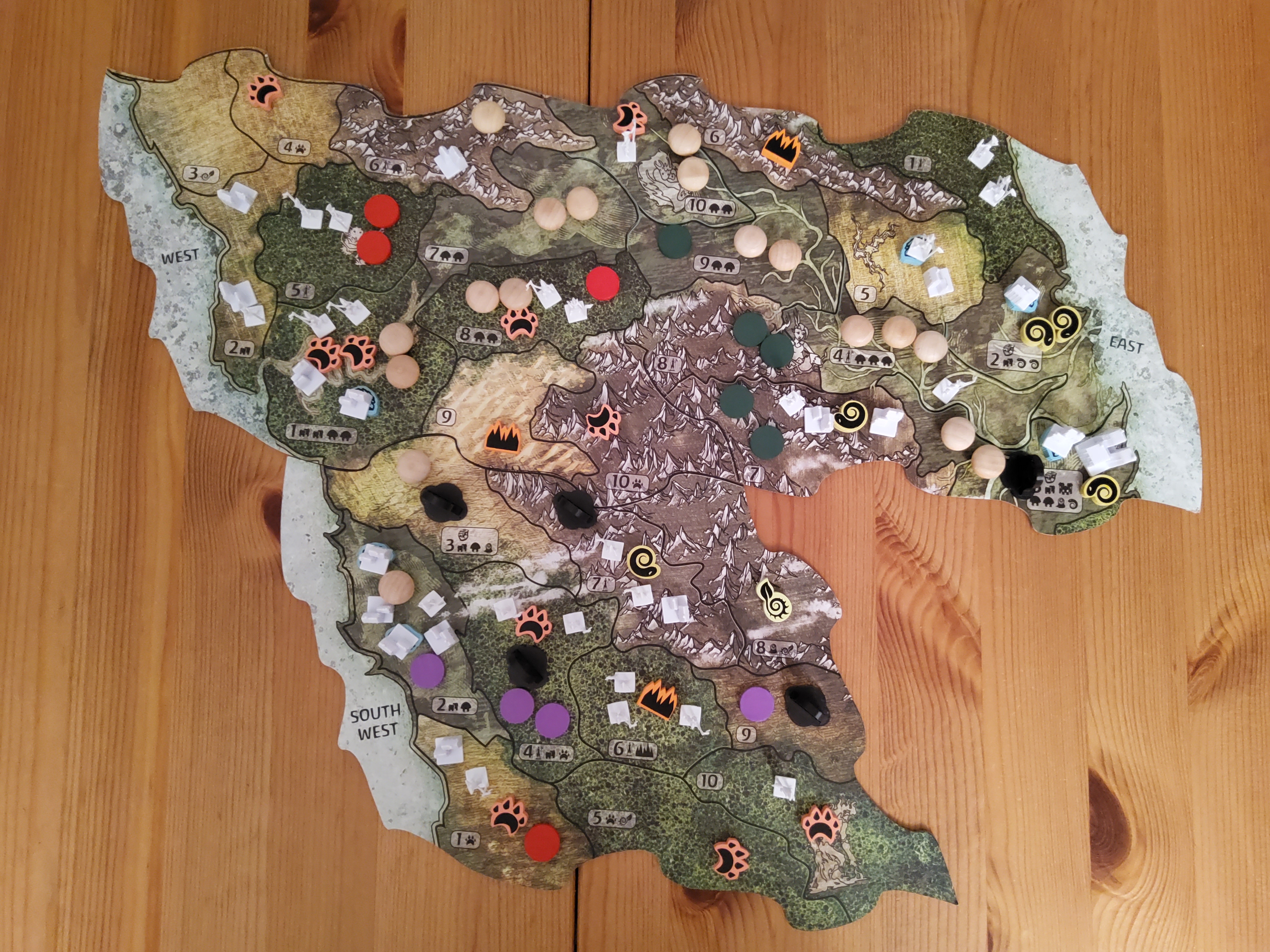 Schmerz und Kummer teilen auf SW3: 2 Furcht, ich verschiebe 1 Entdecker und 1 Dorf (mit Streit) nach SW2.