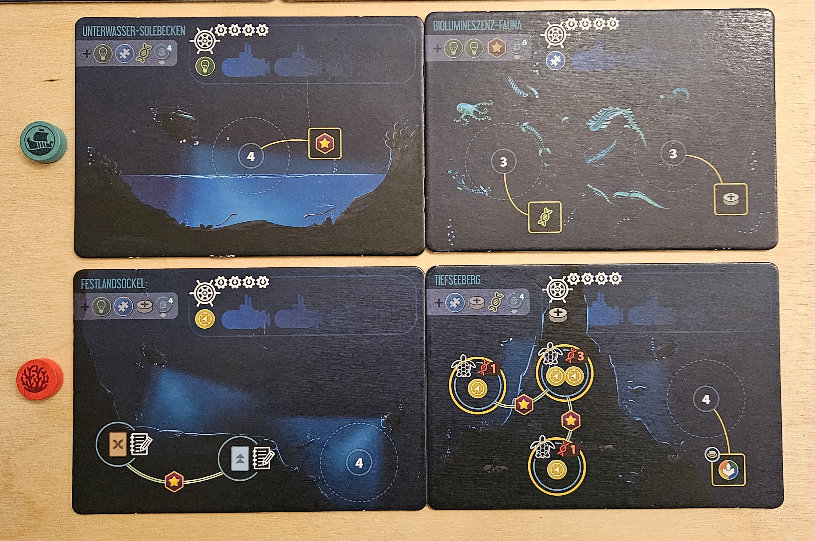 - Die Oktopus AG gibt ihrer Mini-U-Boot-Spezialistin die Anweisung, zuerst das U-Boot von ??? zu den Tiefseeschnecken zu bewegen (+1 Scheibe) und dazu tauchen zu gehen: +3 Wissen oder eine zusätzliche Bewegen-Aktion. Dazu wird dank des Tauchens eine Publikation ("Machbarkeitsstudie: Unterwasserkuppel-Labor") veröffentlicht.