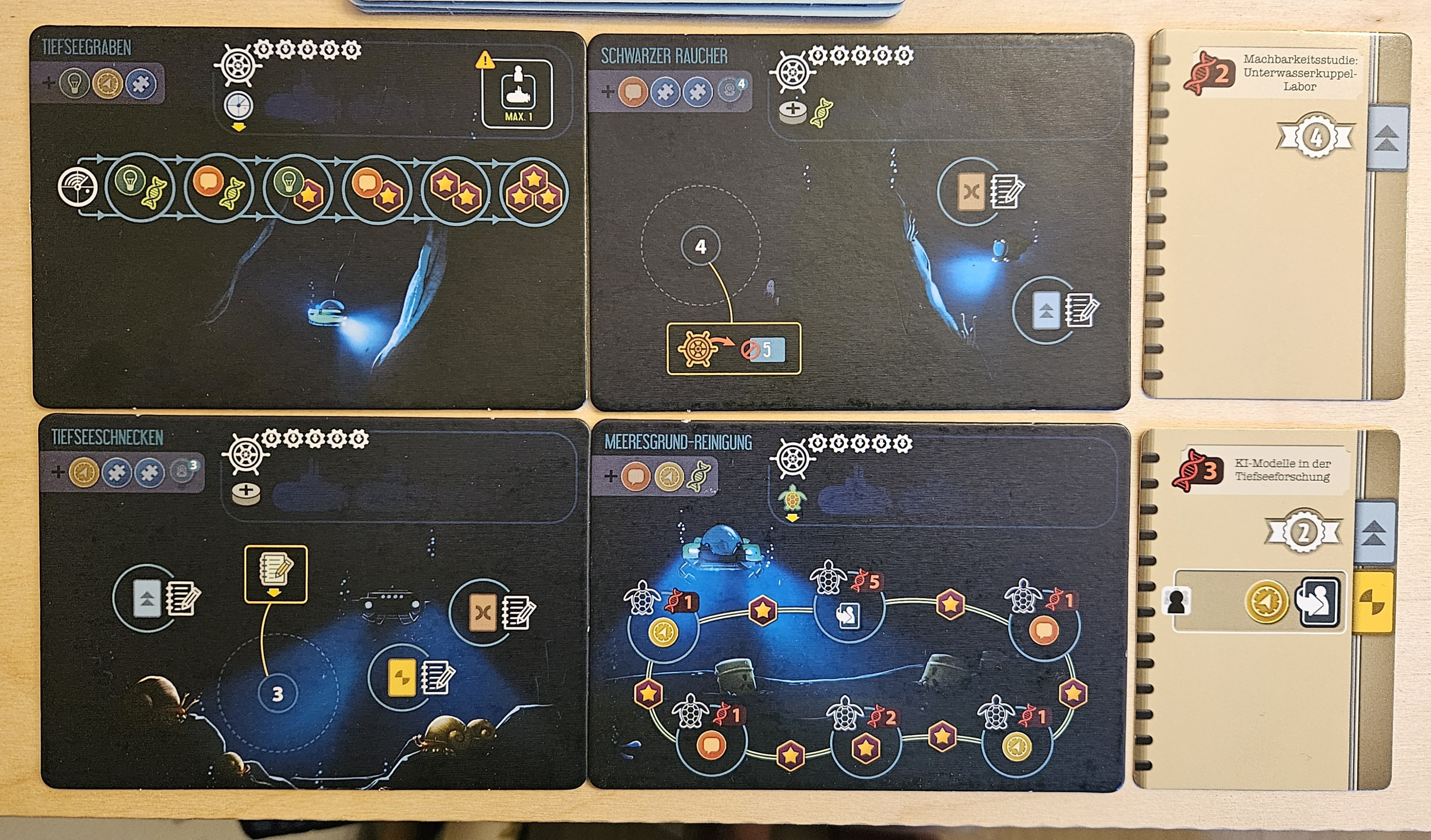 - Die Oktopus AG nutzt eine Scheibe auf dem Tauchfeld ihrer Publikation für den letzten Tauchgang bei den Tiefseeschnecken. Sie erhält 3 Wissen und nutzt diese gleich für die Publikation "KI-Modelle in der Tiefseeforschung". +1 Organisation. Damit wären bei den Tiefseeschnecken alle Aktionen ausgeführt.