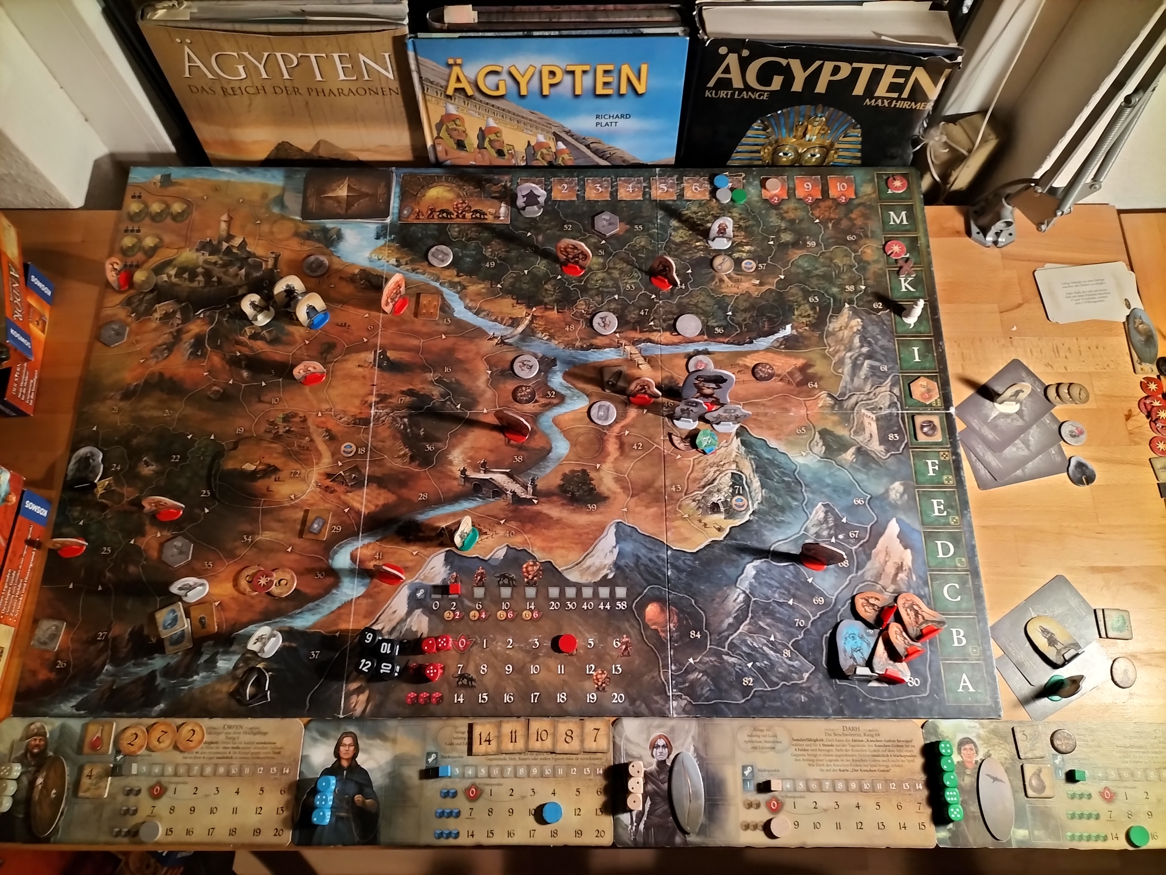 Hier wieder das aktuelle Bild. (Die Karten an der Legendenleiste wurden jetzt durch Eriegniskarten an entprechender Stelle dargestellt - die Farbe entspricht der Farbe des Pfeils, bisher recht einfarbig. ;) Der Einhornreiter markiert die Karte "Der Schatten" und das Reka-NP die Karte "Asche und Staub".)