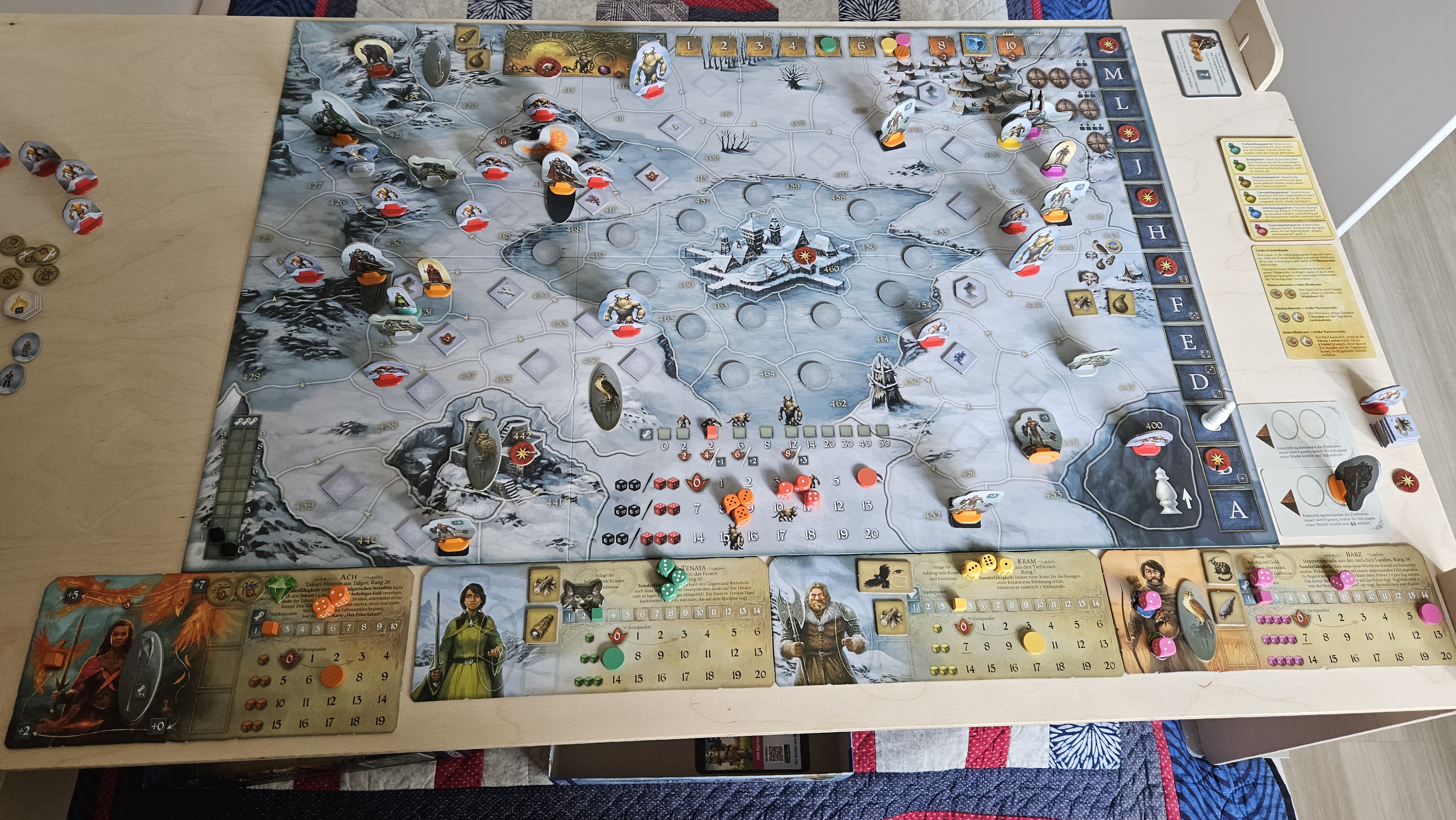 - Barz wanderte bis zum Knochenturm auf Feld 450 (7.h) und rettete den Hornfalken vor den Wilderern. Mit dem Fernrohr erspähte er auf Feld 449 ebenfalls Blaubachbeeren und auf 451 Brennholz. Dann schickte er das Fernrohr an Kram, der von seinem Feld aus den Schnee absuchte: Auf den Feldern 408 und 411 sah er jeweils 1 Schneesturm und auf 412 1x rotes Blutkraut.