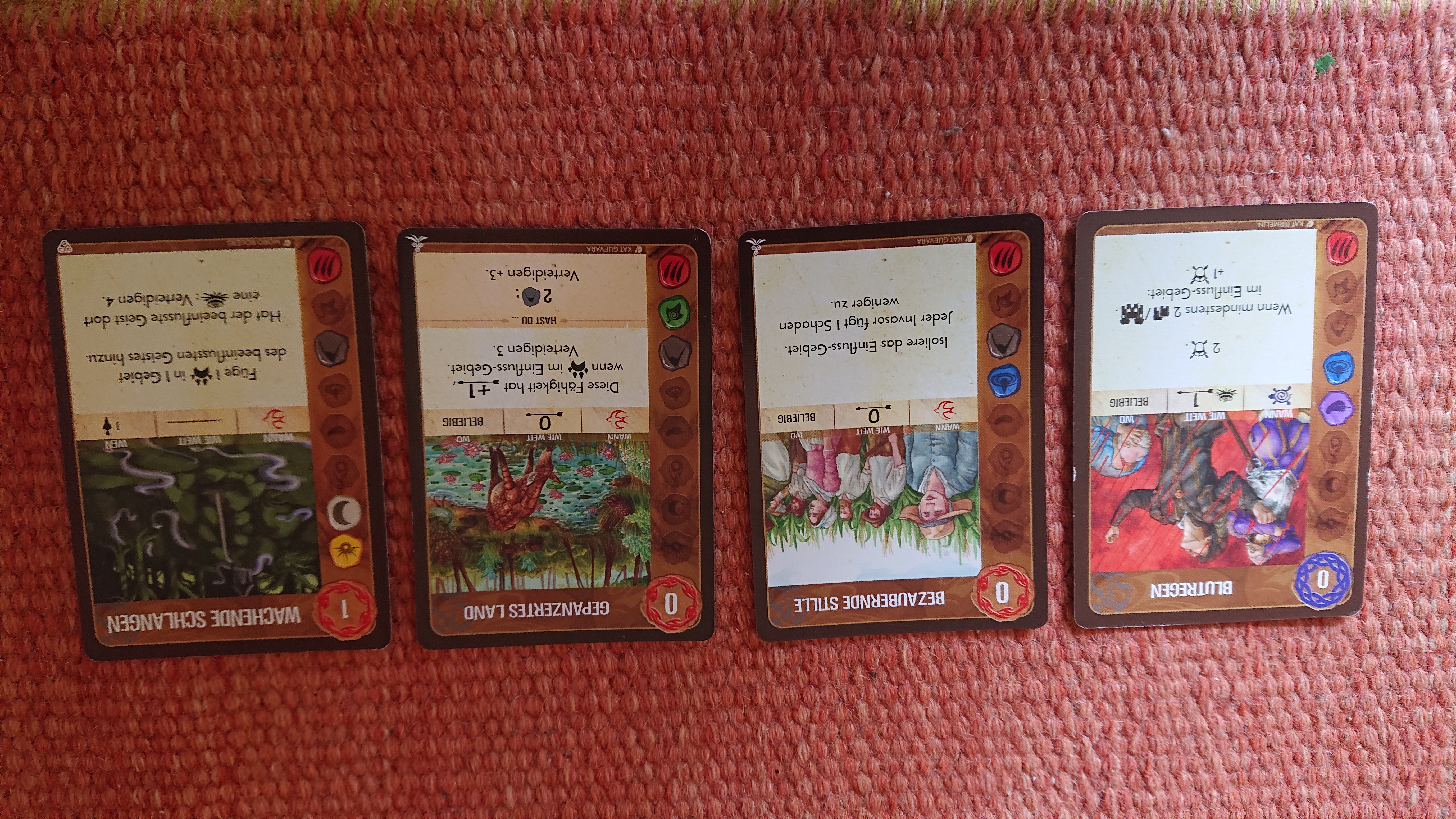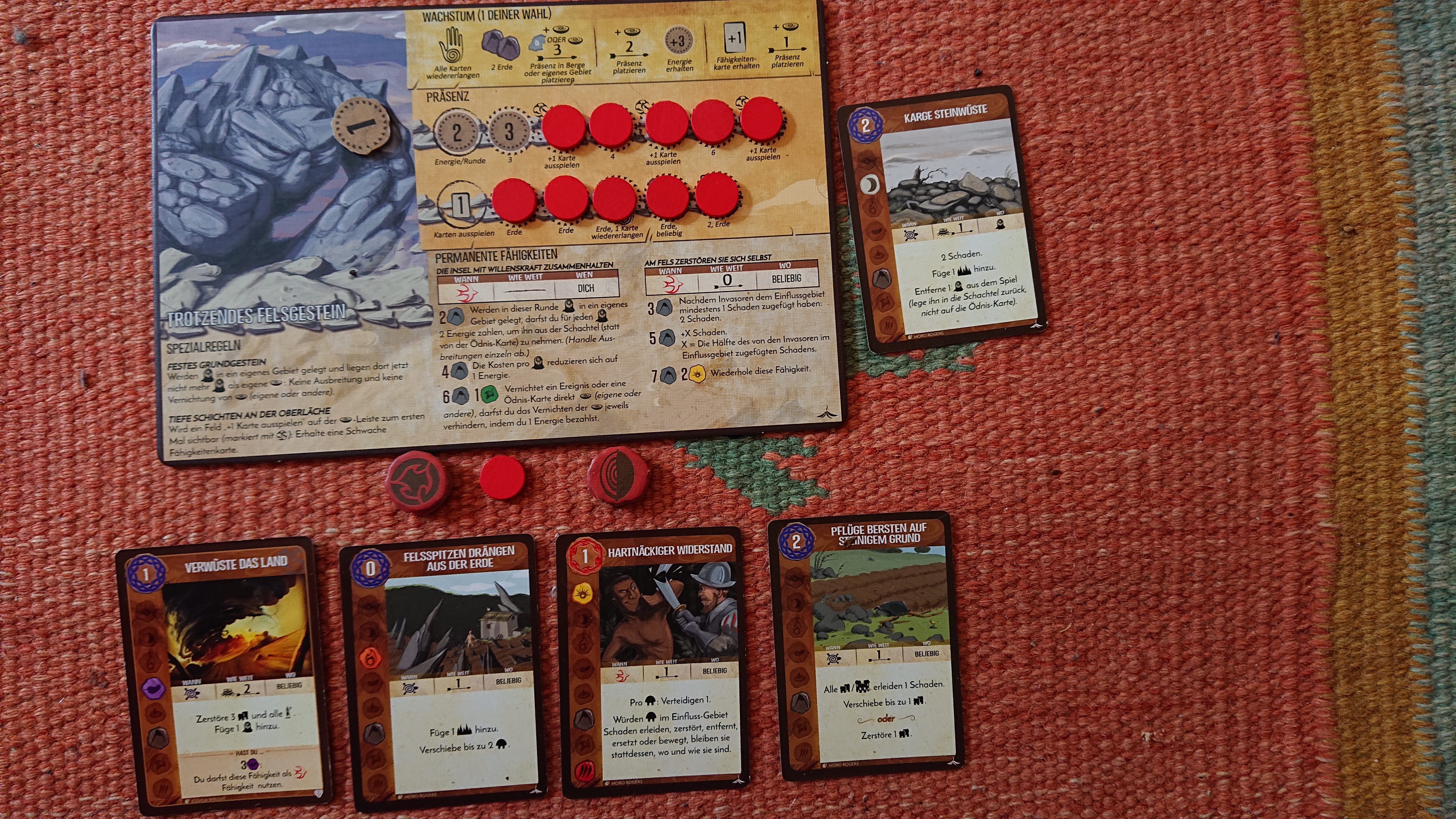 Als erstes: Nutztiere drehen durch, wird auf D7 gespielt. Das gibt 1 Furcht und Verteidigen 5. Das sollte für 1 Dorf und 1Stadt reichen. Den Rest erledigen die drei Dahan.