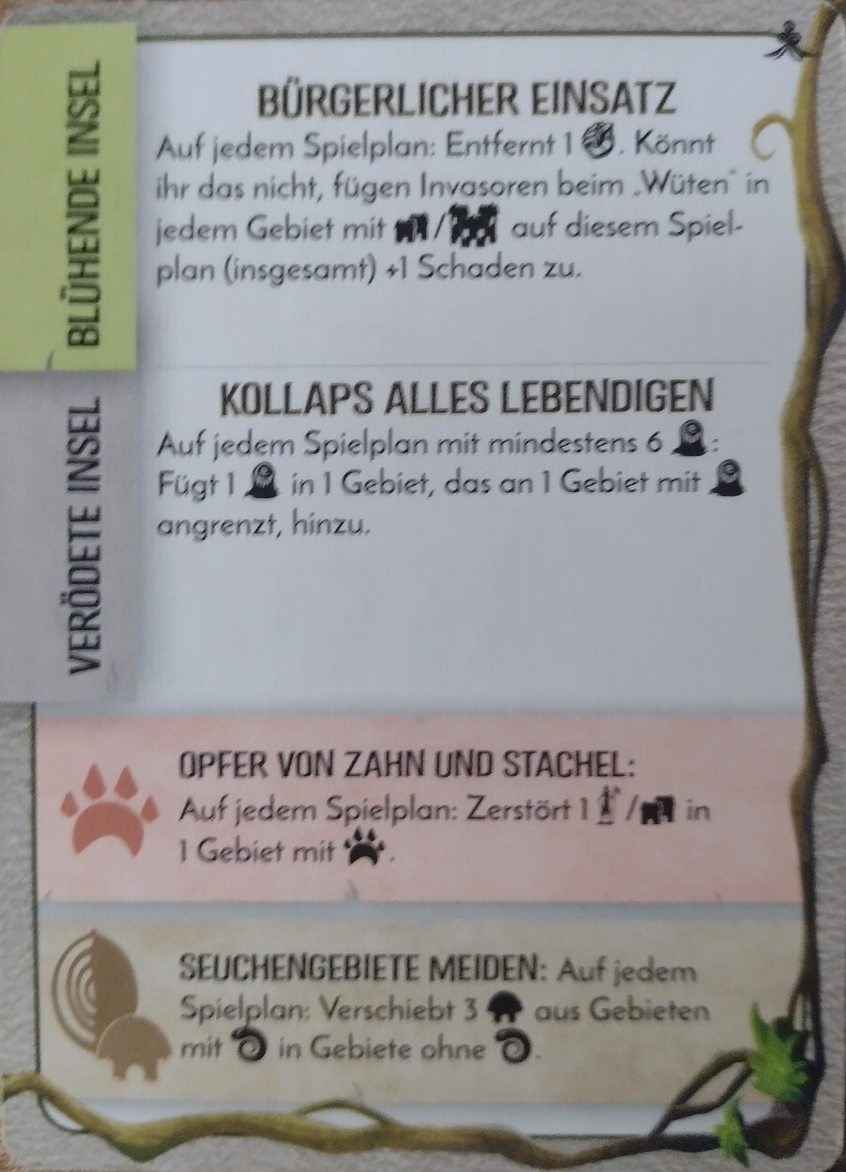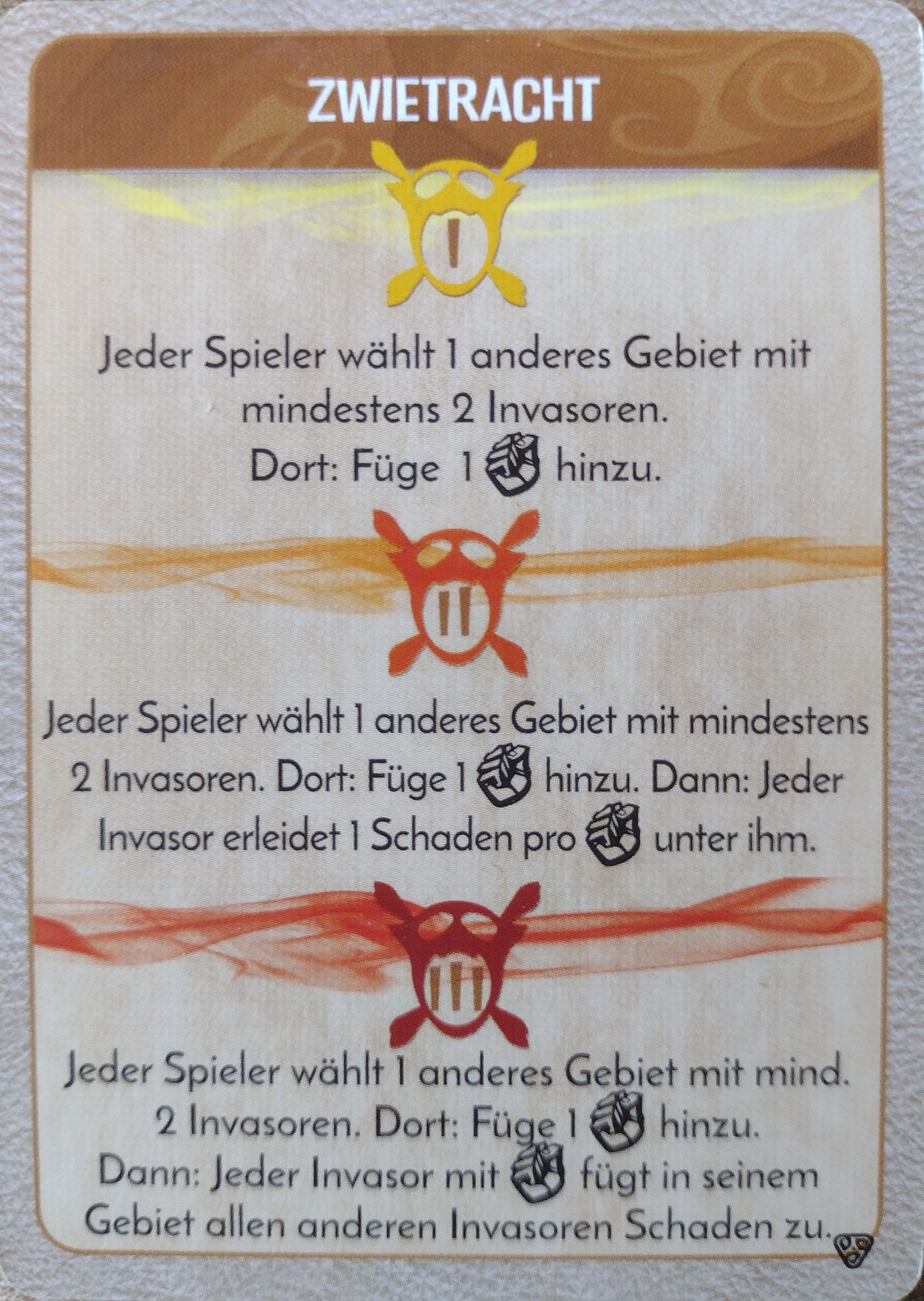 Vom Dschungel verschlungen (-1) auf D4: Ich mache 5 Schaden, +1 Schaden von der Einöde: Alle 3 Dörfer zerstört! 2+3 =5 Furcht!