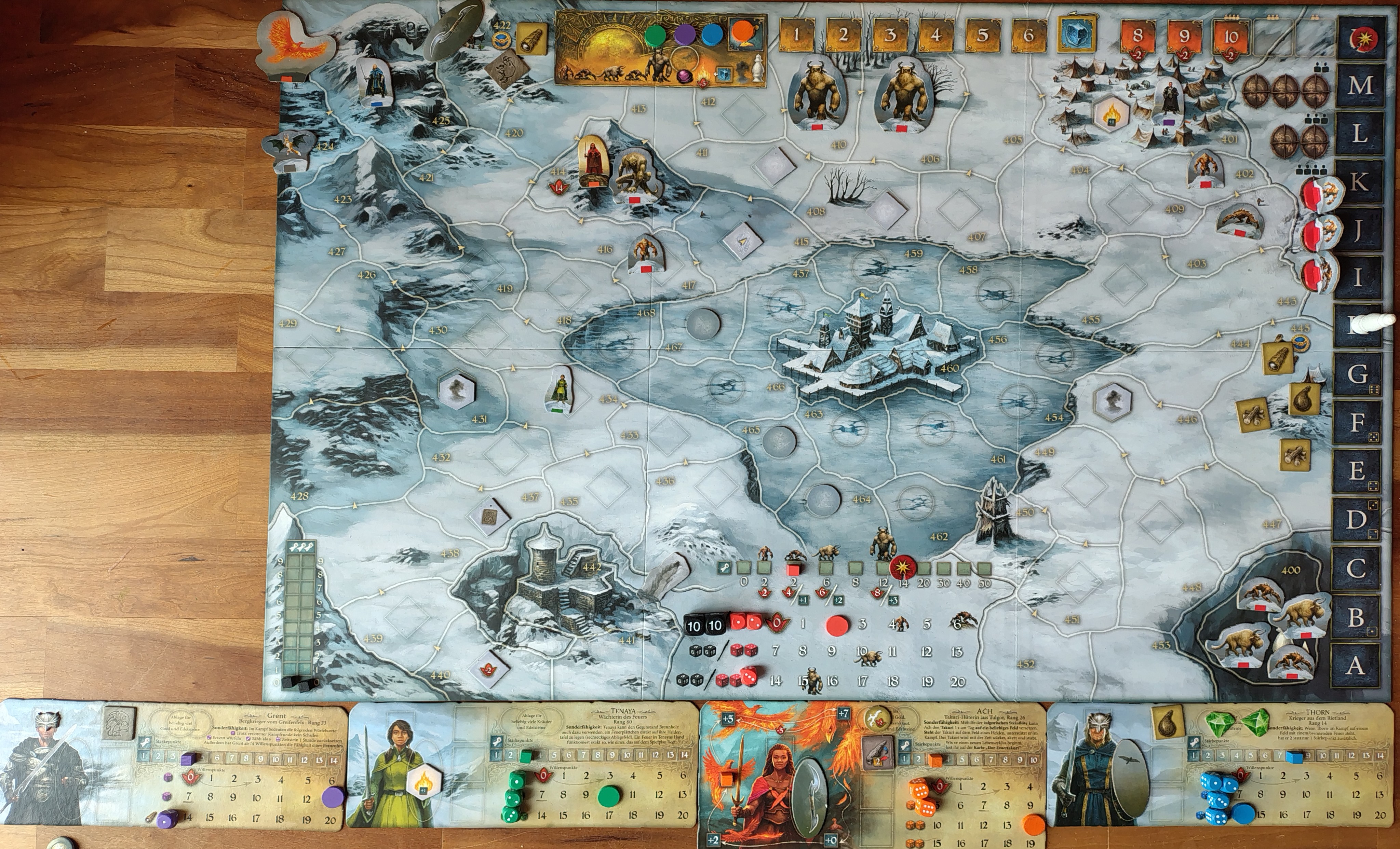 -Thorn bekämpft die Myrk: Mit den Kräuter würfelt er eine 10, insgesamt Kampfwert 21. Die Myrk wehrt sich verzweifelt (gewürfelte 6), aber 20 reicht ihr nicht. Thorn schubst sie vom Spielplan (6.h)