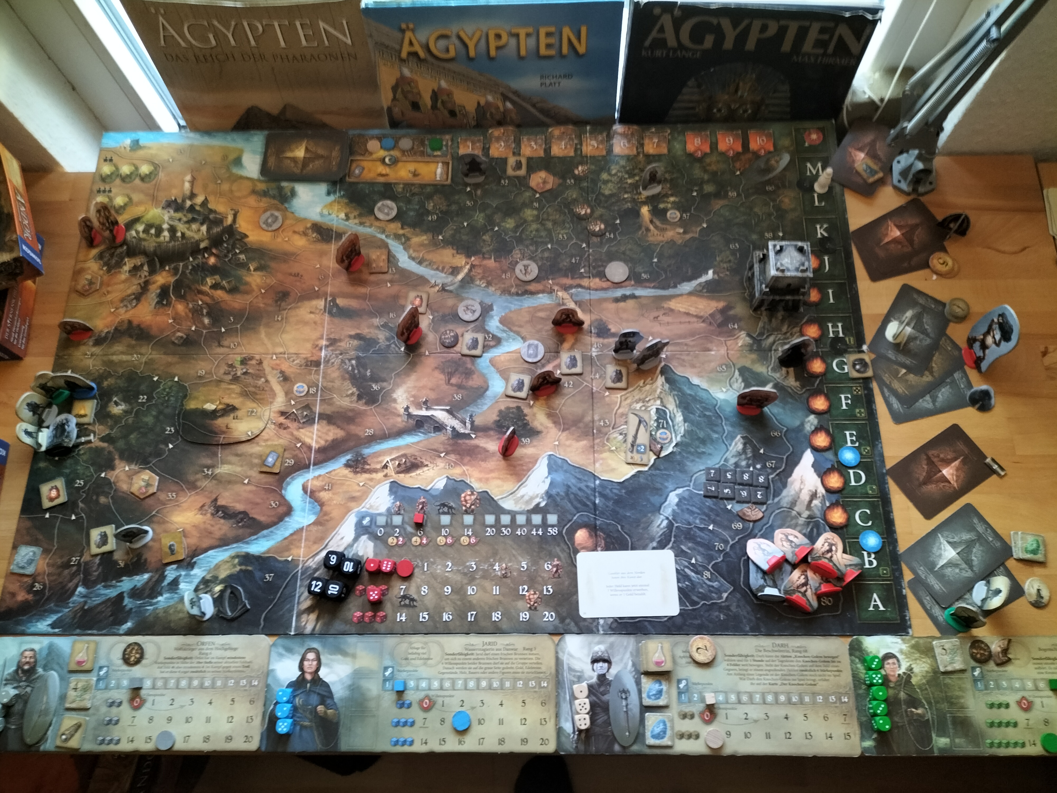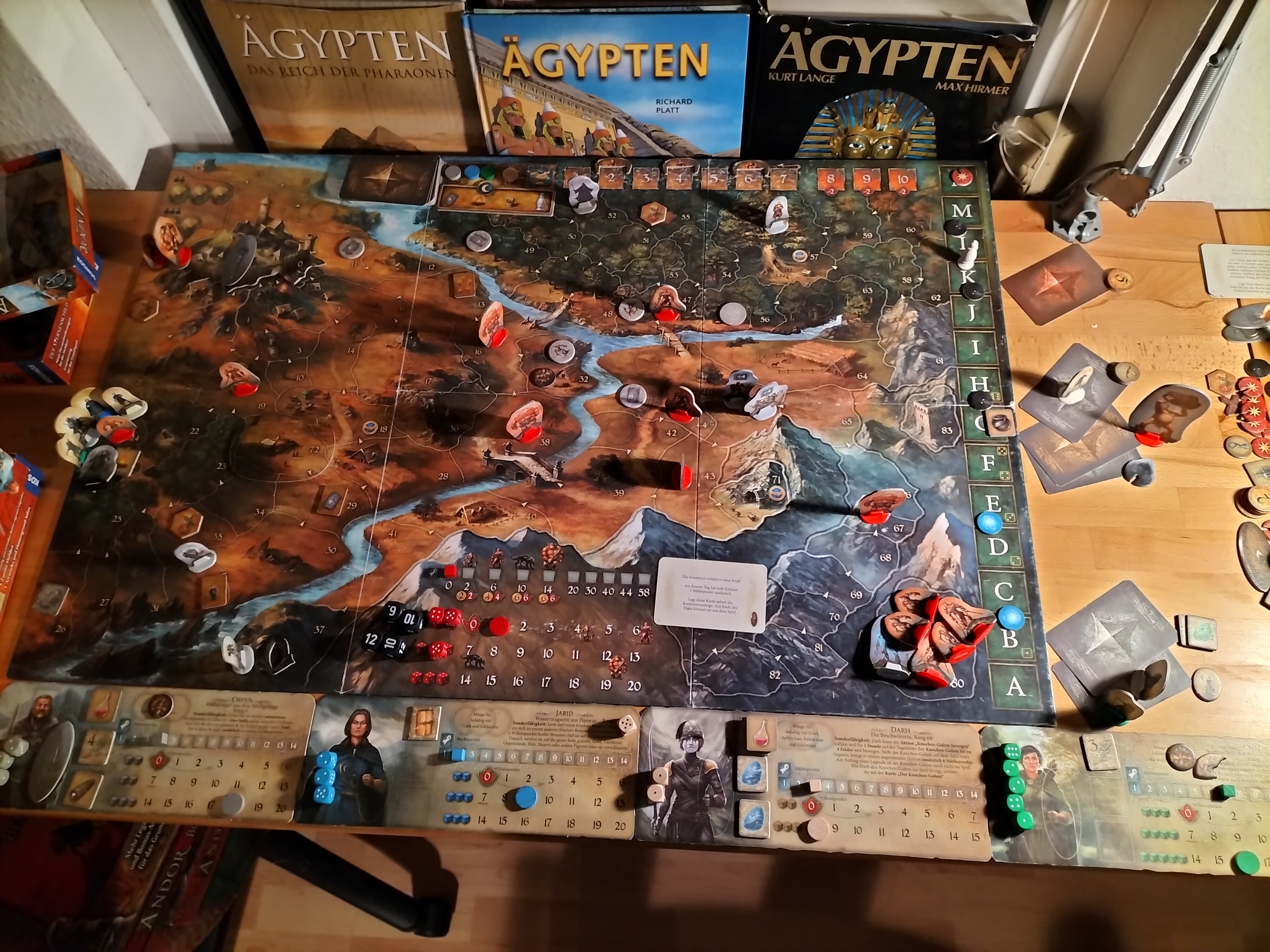 Stellt alle Helden und alle Gegenstände auf Feld 16 jetzt wieder auf Feld 24 und legt Aikar dazu. Aikar kann ab jetzt nicht mehr mitbewegt werden. Führt nun eine Dämmerung mit Zeitsprung durch. Ihr entscheidet selbst, zu welchem Lichtplättchen ihr den Zeitsprung durchführen wollt.
