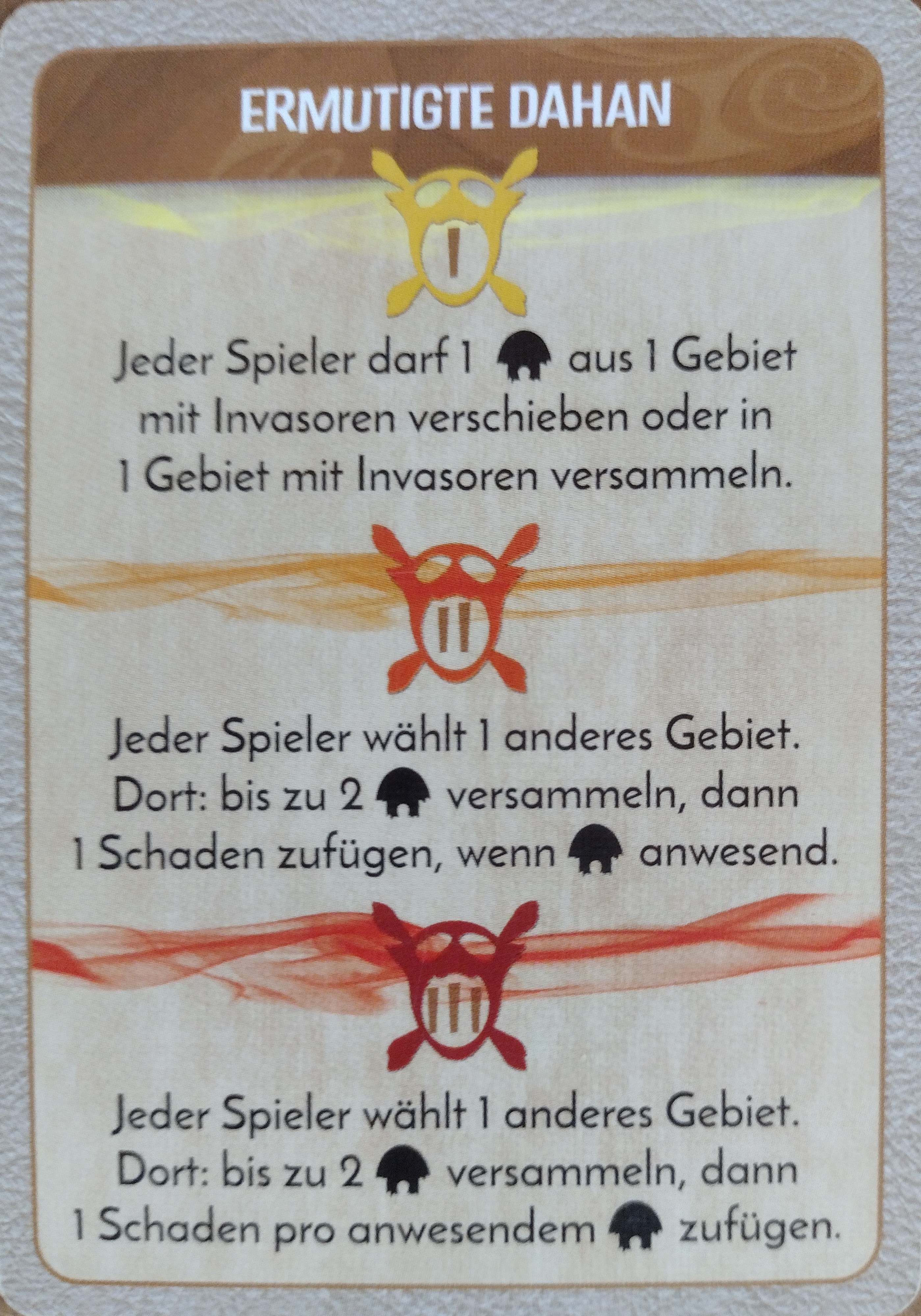 Wenn ja, spiele ich die Furchtkarte auf die Wüste 3. Dort versammele ich zwar keine Dahan hin, aber der vorhandene Dahan zerstört 1 Entdecker.