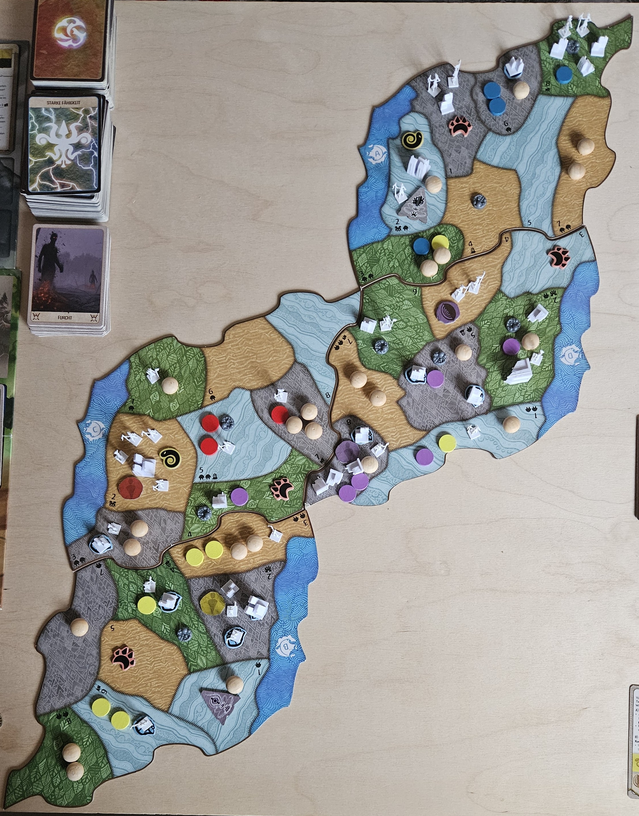Bei den Geistern habe ich die Wachstumsoptionen ausgeführt und links der Tableaus die Karten hingelegt, die nach den Plänen ausgespielt werden. Die Energie habe ich noch nicht bezahlt.