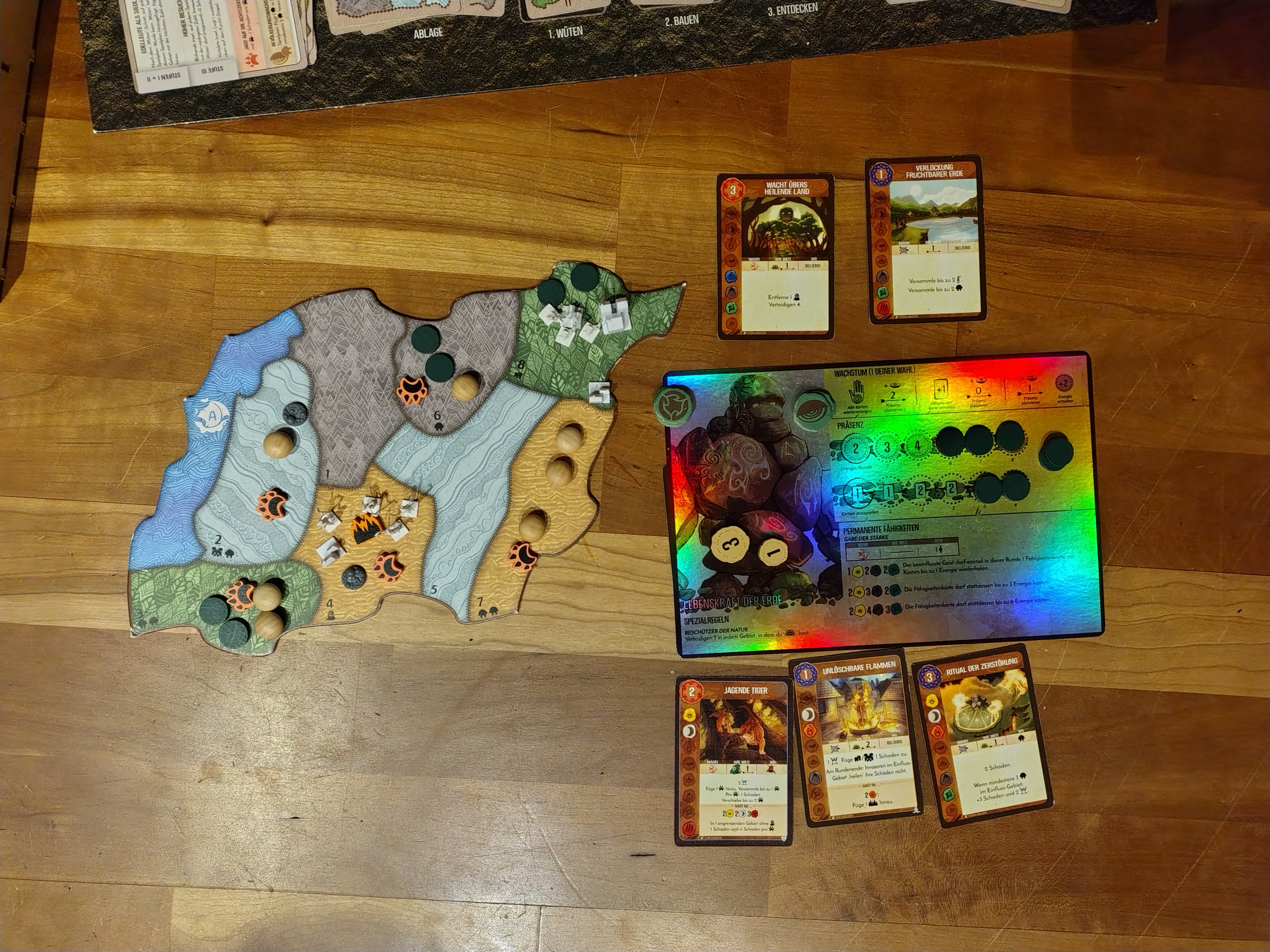 Ob die neuen Ereigniskarten jetzt so viel hilfreicher sind als die alten, kann ich nicht so direkt sagen. Die Dahan-Effekte sind auch auf anderen Karten vorhanden. Ein Effekt, der einfach so eine Bestie auf jeden Spielplan hinzufügt, gab es schon auf einer Katze aus A&T. Die unregelmäßigen Ausbrüche gibt es ebenfalls, lediglich das zerstörte Ökosystem, das eine Einöde in ein Gebiet mit Ödnis hinzugefügt, ist neu. Finde ich aber jetzt nicht zu stark oder so, auch andere Effekte machen mal ein bisschen Schaden. Auch die Plättcheneffekte finde ich also ganz normal. Die zugezogenen Siedler (1. EK) sind quasi Schottlands Eskalationseffekt. Nicht wirklich hilfreich. Die weit entfernten Kriege ersetzten eine Karte, die in deinem Spiel bereits vorkomm. Ich weiß nicht, wie genau die hieß, aber im Endeffekt hat sie in einem Küstengebiet Schaden an Land und Invasoren in Höhe der Kosten einer zufälligen starken Fähigkeit gemacht (aus A&T). Die wurde regebalanced, weil die ursprüngliche Version zu stark war. Wir zerstören also jetzt die Hälfte der Gebäude für 2 Ödnis anstatt dass wir für eine Ödnis 2-9 Schaden machen. Nicht schlecht, aber weniger hilfreich, als die alte Karte. Die letzten Karte kostet jeden Geist entweder eine Präsenz und eine Energie oder erlaubt es, eine Karte (keine starke Fähigkeit) gratis auszuführen, wenn man diese vergisst und seine Hand ablegt. Auch eher negativ, wenn man nicht zufällig vorhat, seine Hand im nächsten Zug aufzunehmen.