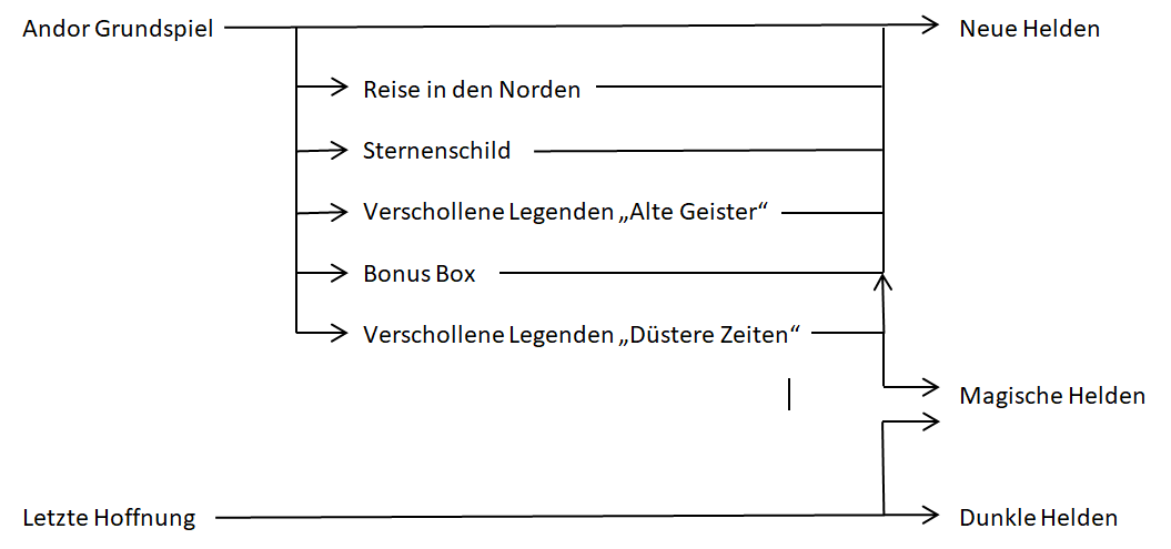 Vielleicht macht es Sinn, um den mittleren Bloch einen Kasten zu ziehen. Dann geht da ein Pfeil von Grundspiel hin und vom Kasten dann jeweils ein Pfeil zu den jeweiligen Helden. Könnte klärer und strukturierter aussehen, wenn die Pheile sich nicht zu sehr auffächern.