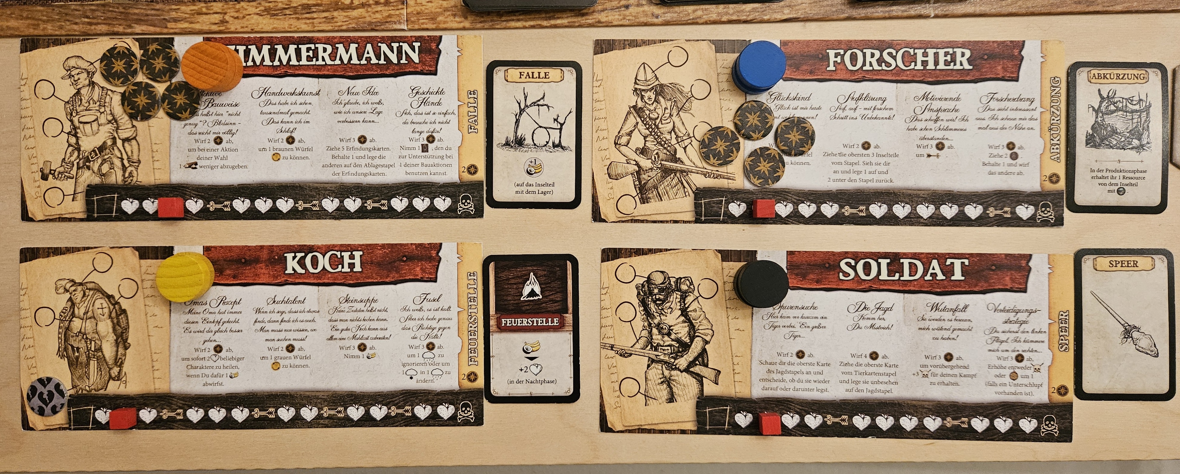 Forscherin und Koch bauen zusammen mit je 1 Aktionsstein das Feuer. Nach der Aktionsphase erhalten wir +1 auf unsere Palisadenstärke. Ab dann sind auch die Laterne und die Feuerstelle zum Bauen möglich.