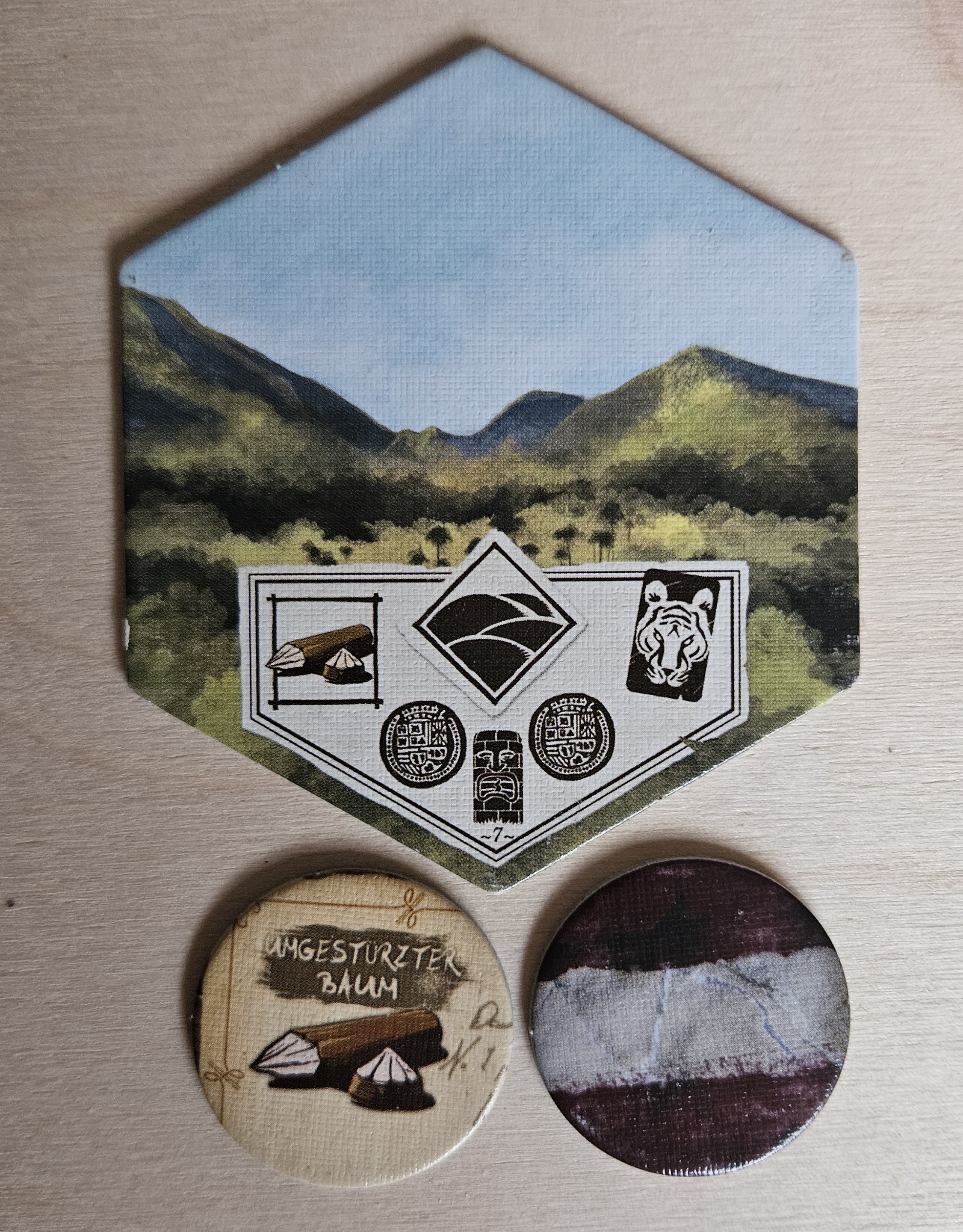 Zur Wiederholung: Das Buch-Symbol können wir ignorieren. Jetzt müssen wir uns entscheiden, welche Ressourcenquellen auf Inselteilen angrenzend zu den Hügeln (wo unser Lager liegt) wir mit grauen Markern abdecken wollen. Dort können wir ab jetzt keine Ressourcen mehr sammeln. Ich wäre für die beiden Steppengebiete, also eine Holzquelle und eine Nahrungsquelle.