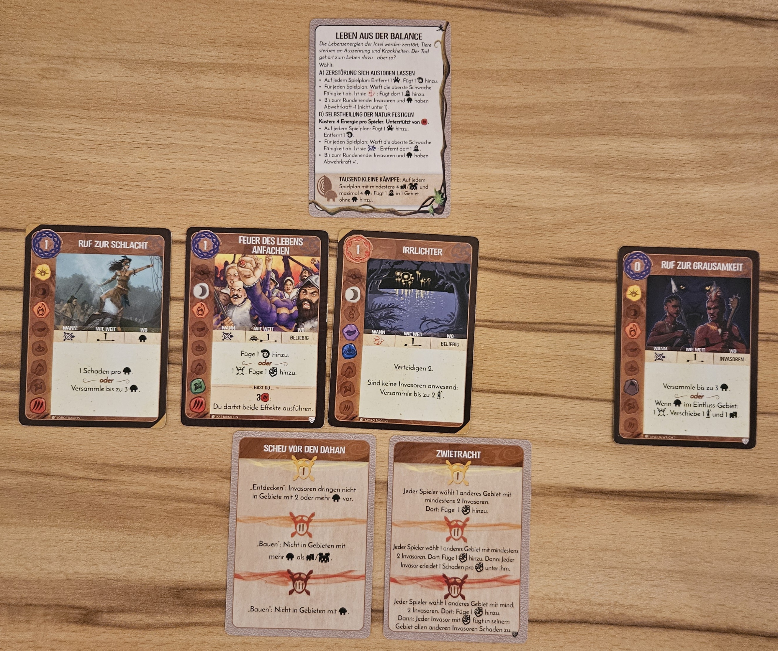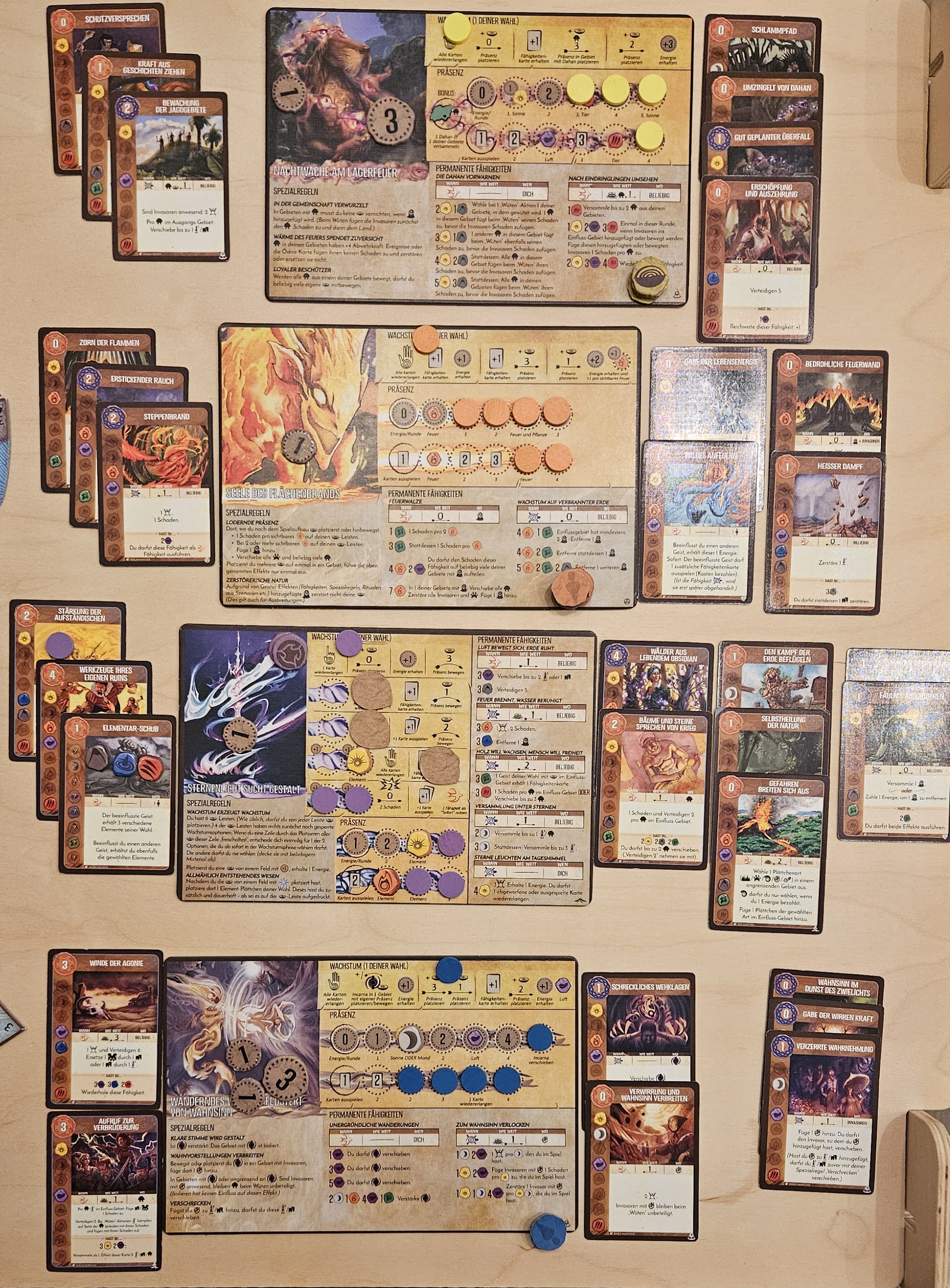 Am Rundenende: dank der Geschichten am Lagerfeuer nehme ich den Elementarschub auf die Hand. Die +1 Energie sollte ich ja schon bekommen haben, da die Dahan ja zum Zeitpunkt des Ausspielens bei meiner Präsenz waren.