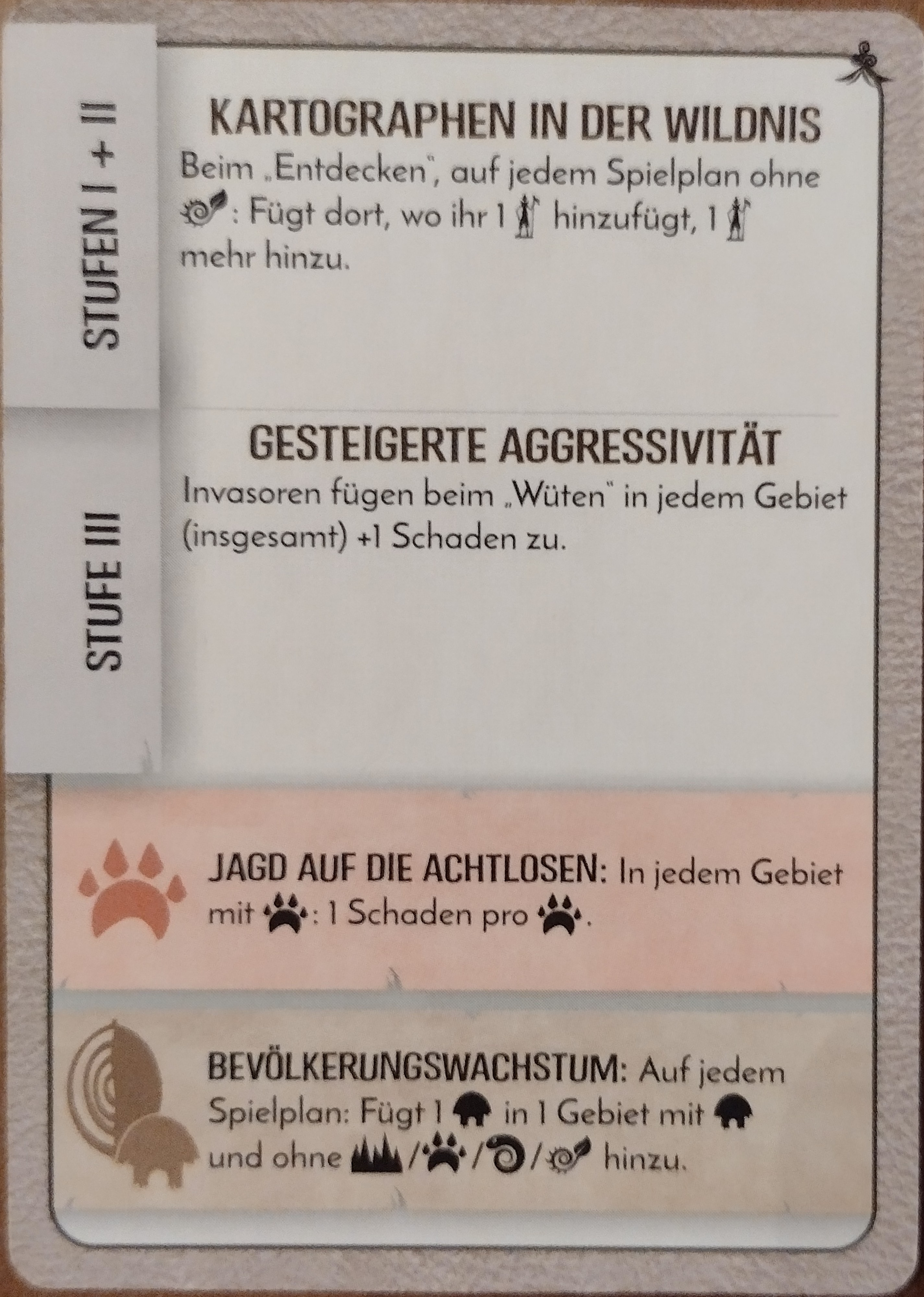 Edit: wenn die Seuche in F2 dreimal das Bauen verhindert und mit der wilden Rache 4 Schaden generiert, könnten wir dort auch 2 Städte, 3 Dörfer und alle Entdecker vernichten, was alleine für F2 3+7+4=14 Furcht generiert.