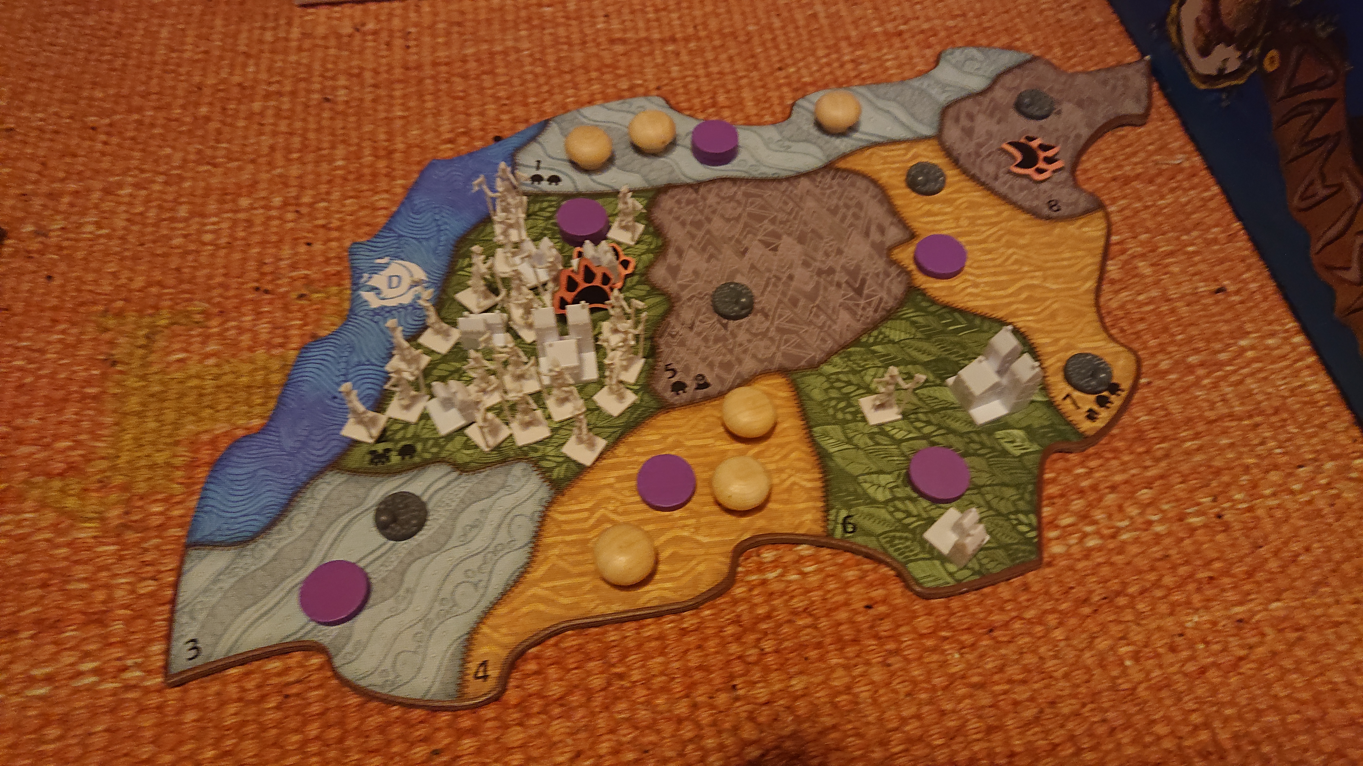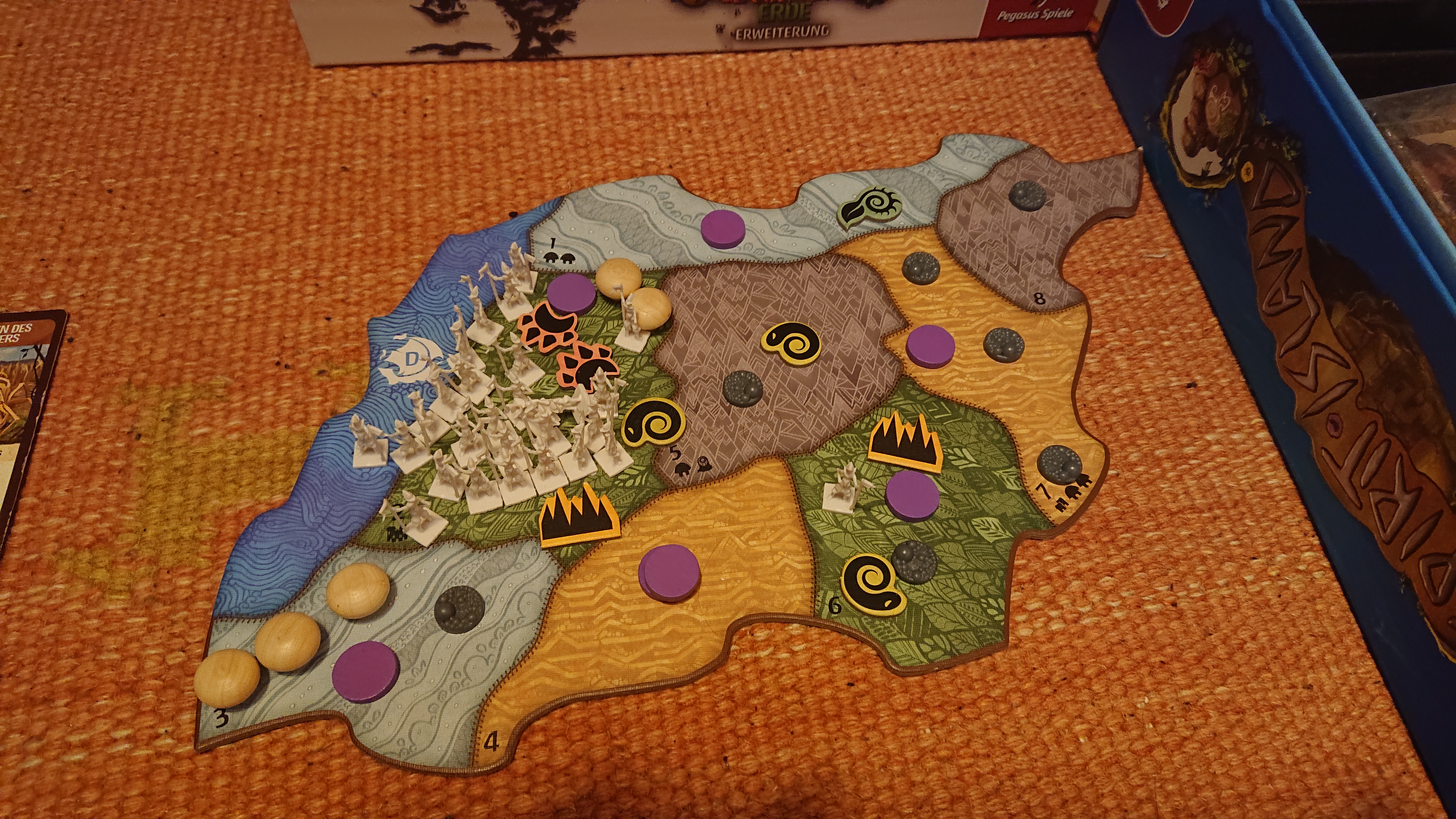 Ich versuchte von Anfang an all meine Probleme in einem Land zu konzentrieren, dass optimalerweise ein Dschungel/Sumpf mit Bestie war. Das war wichtig, um sämtliche Eskalation und Russland-6-Effekte (1 Dorf und Entdecker in das Land mit den meisten Entdeckern) in einem Land zu haben und das dann einfach jede Runde am Wüten zu hindern (mittels Präsenzvernichtung, wozu ist man schließlich das Grün).