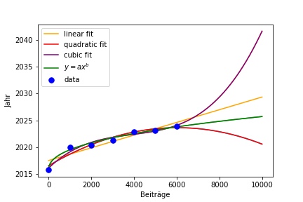 (wäre vermutlich besser gewesen, stattdessen die Anzahl Beiträge pro Jahr zu plotten und zu schauen, wann ein solcher Fit auf 10'000 käme, aber was soll's, aussagekräftig ist es ohnehin nicht ;) )