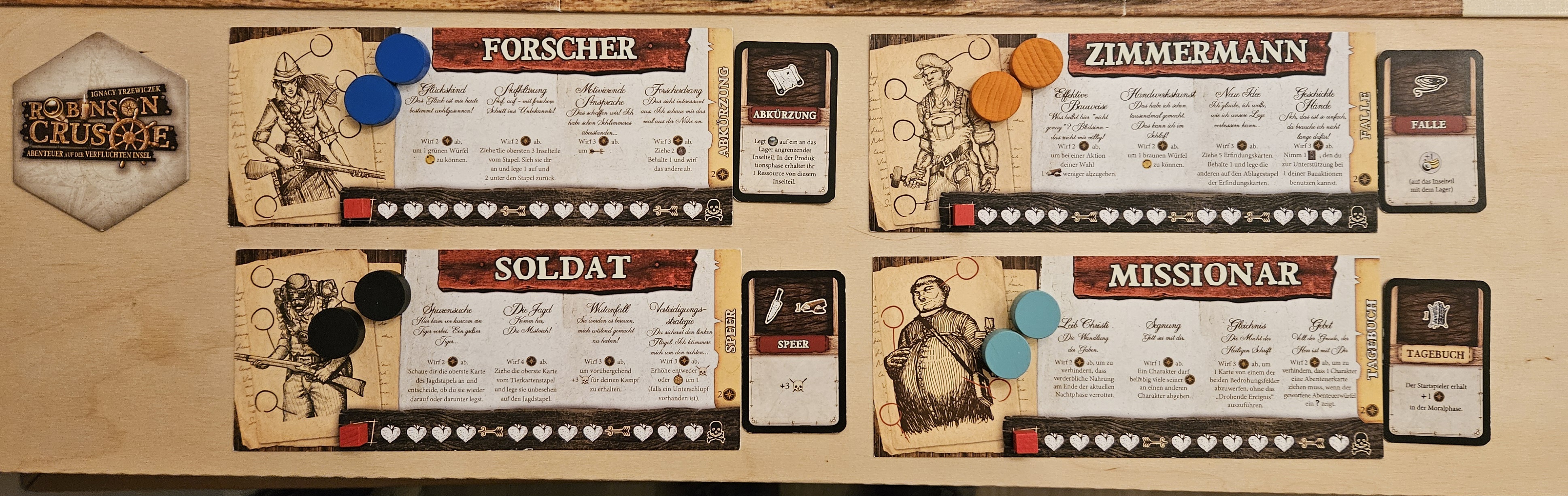- Unsere Startgegenstände sind dieses Mal die "Pistole" sowie die "Bibel": Wird eine Aktion Lager aufräumen ausgeführt, kann man einen Marker (oder beide) abgeben und dafür zusätzlich je ein Entschlossenheitsplättchen erhalten und eine Wunde heilen.