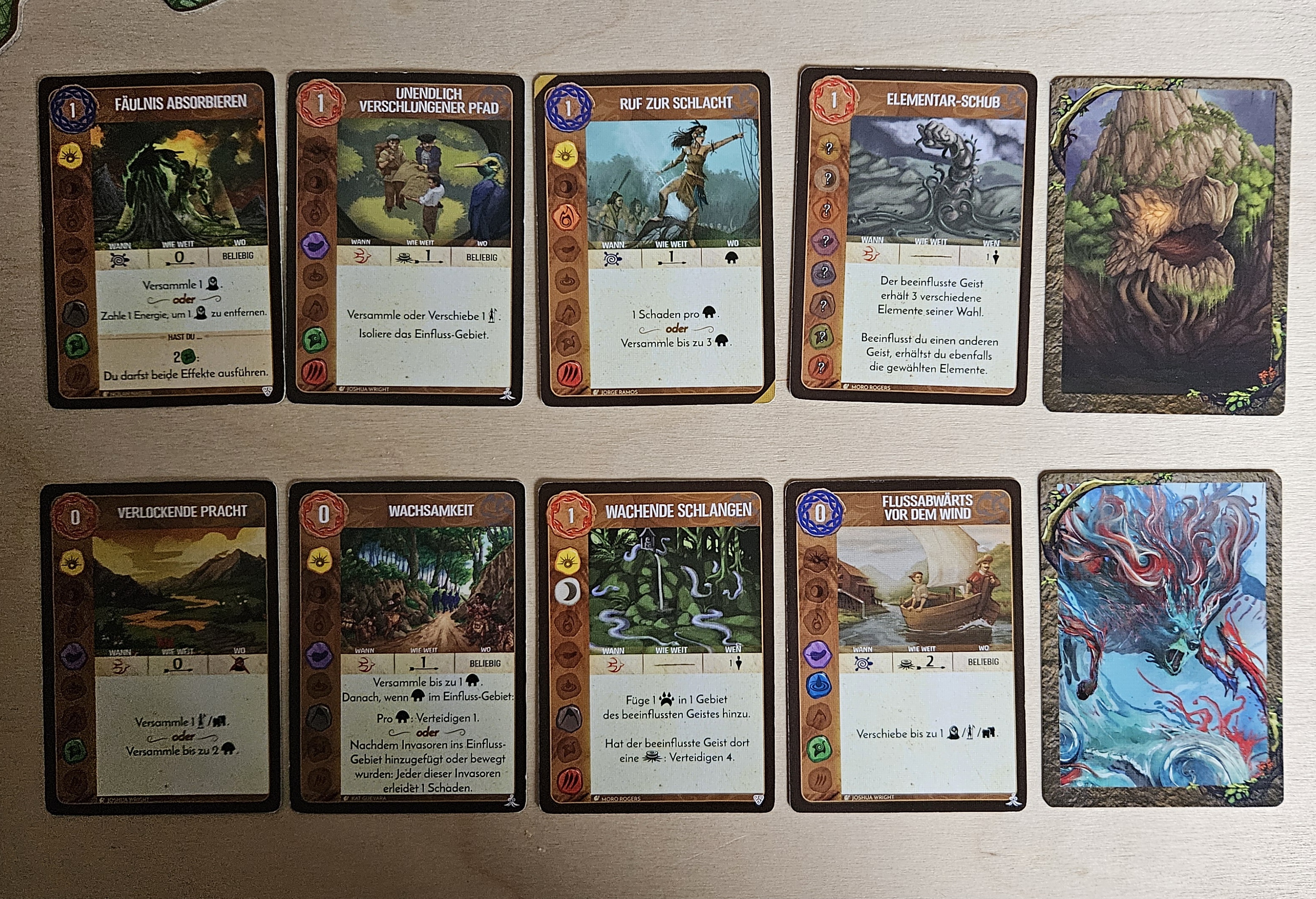 Die unteren 4 Karten sind die "Heilungskarten", die er ab der 3. bzw. 5. Runde bekommen kann. Allerdings nur 2 davon. Die anderen beiden kommen aus dem Spiel. Der Geist muss sich also entscheiden, welchen Weg er einschlagen will: den Weg des "aufgewühlten Wassers" oder des "sanften Wassers".