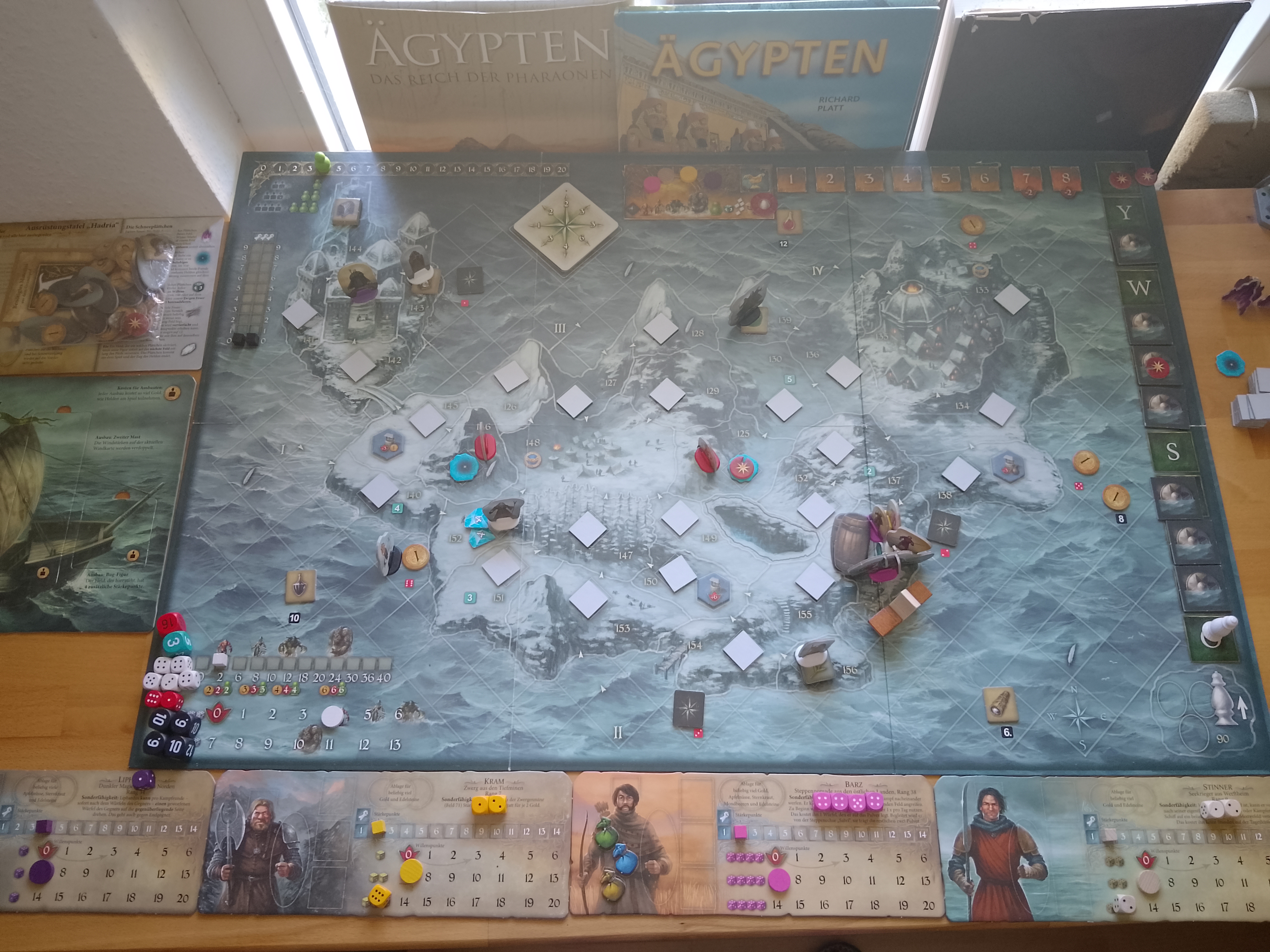 Die Nordbrunnen sind +1 TS auf 138, +1 Gold auf 145 und der WP-Brunnen auf 150. Die Gaben des Nordens erscheinen bei der roten 1, 2 und 3, die Nixe bei der roten 6. Außerdem das Fernrohr bei der schwarzen 6, das Gift bei 10 und der TdH bei 12.