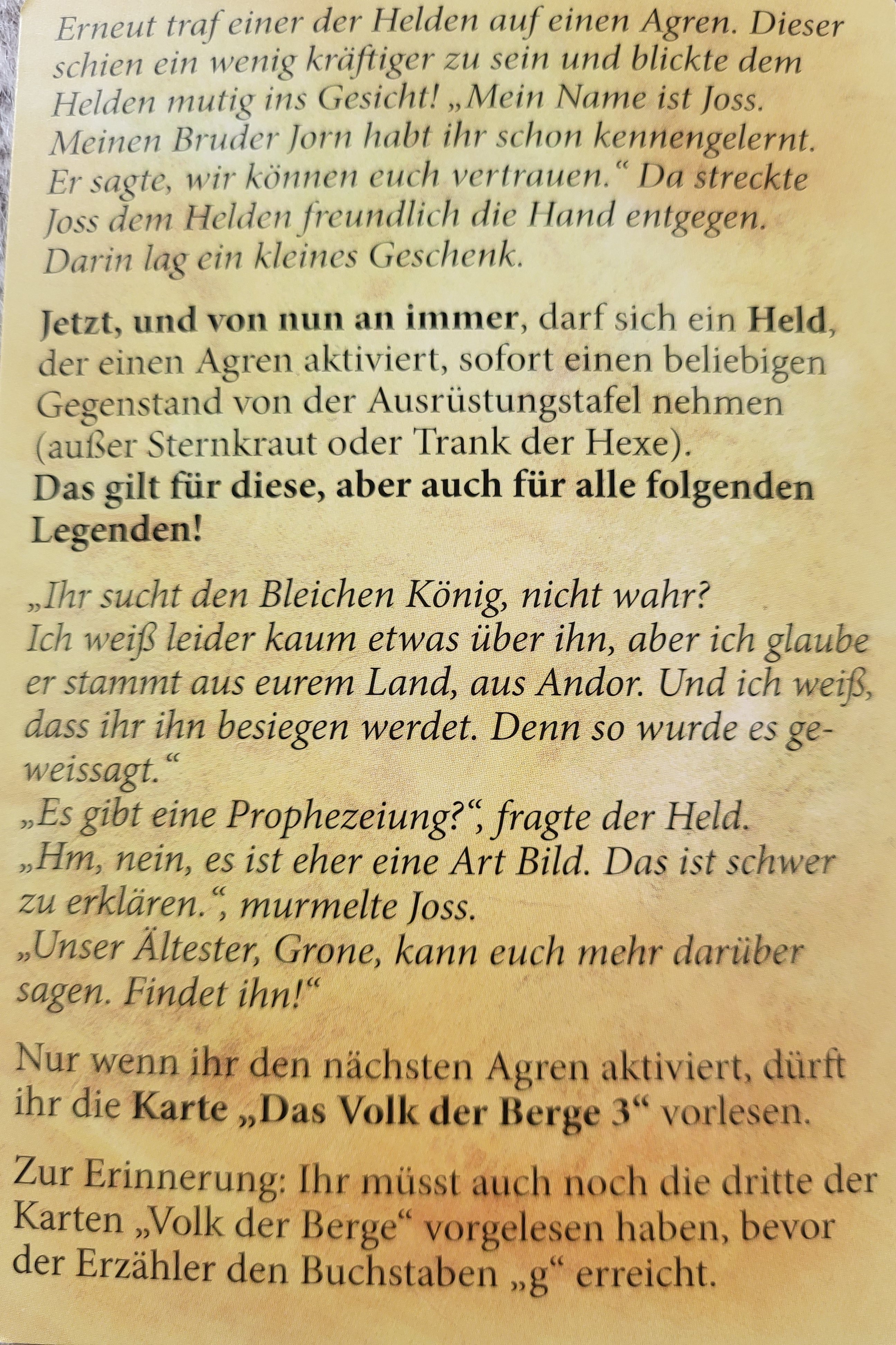 Die Helden machten sich bereit, den Bleichen König zu jagen. Das scheue Bergvolk weiß bestimmt etwas genaueres und Sie machten sich auf die Suche nach Ihnen. Thorn schaute in einer doch leeren Höhle nach und fand dabei einen roten Rubin, Darh sieht trotz Nebel einen Trinkschlauch und Eara erlernt einen neuen Zauber.