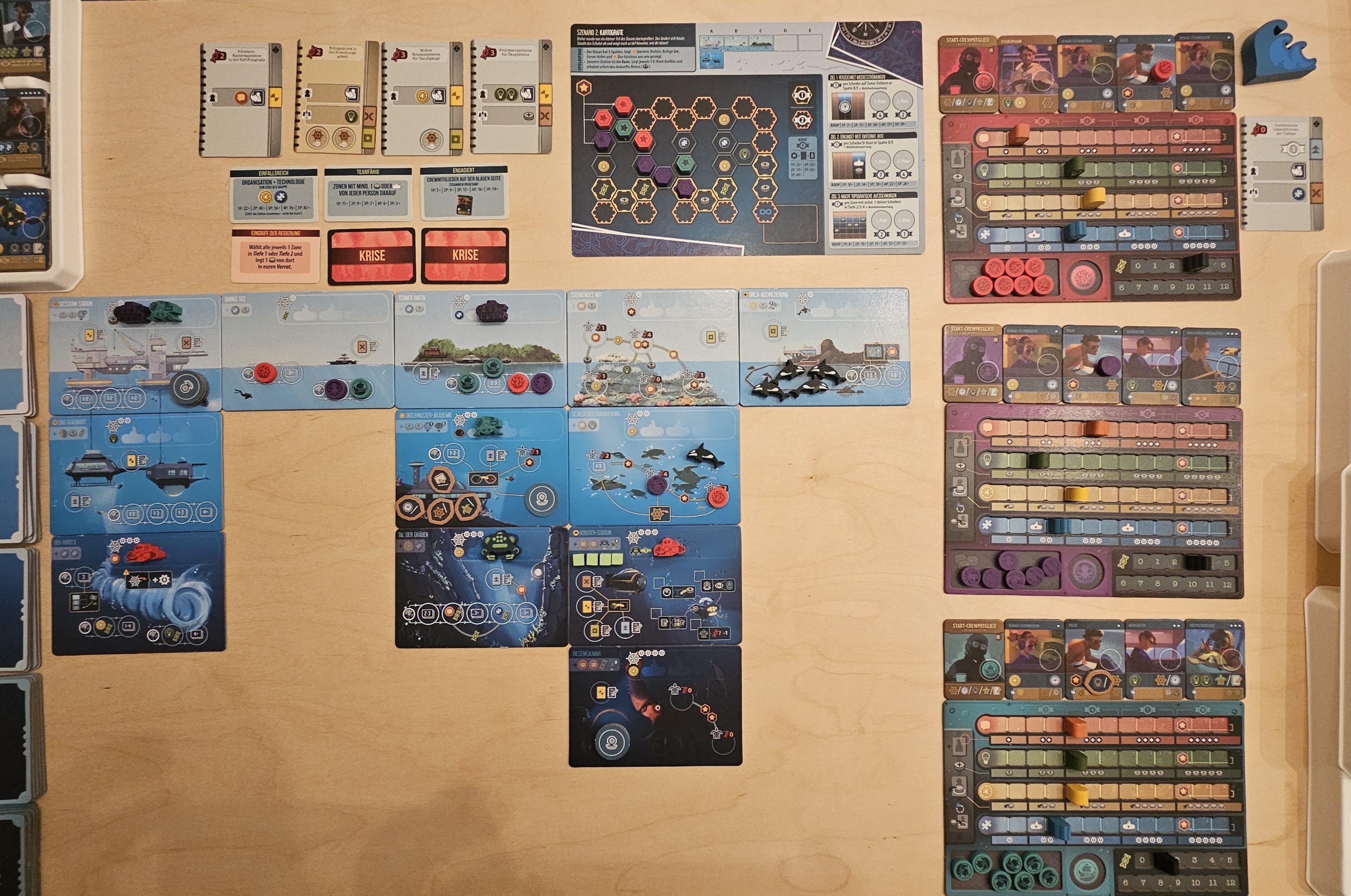 Oktopus AG gibt ihrer Expeditionsleiterin (Sonar-Technikerin mit Bewegungsmarker) den Auftrag, das U-Boot von der Akademie zur Roboter-Station zu bewegen. Dort angekommen wird zunächst der Roboter für Wartungsarbeiten kurz zur Station zurückgeholt und anschließend wieder ins Tal der Gräben geschickt, um ein Sonar auszuführen. 2x Tiefe 3 und +1 Organisation