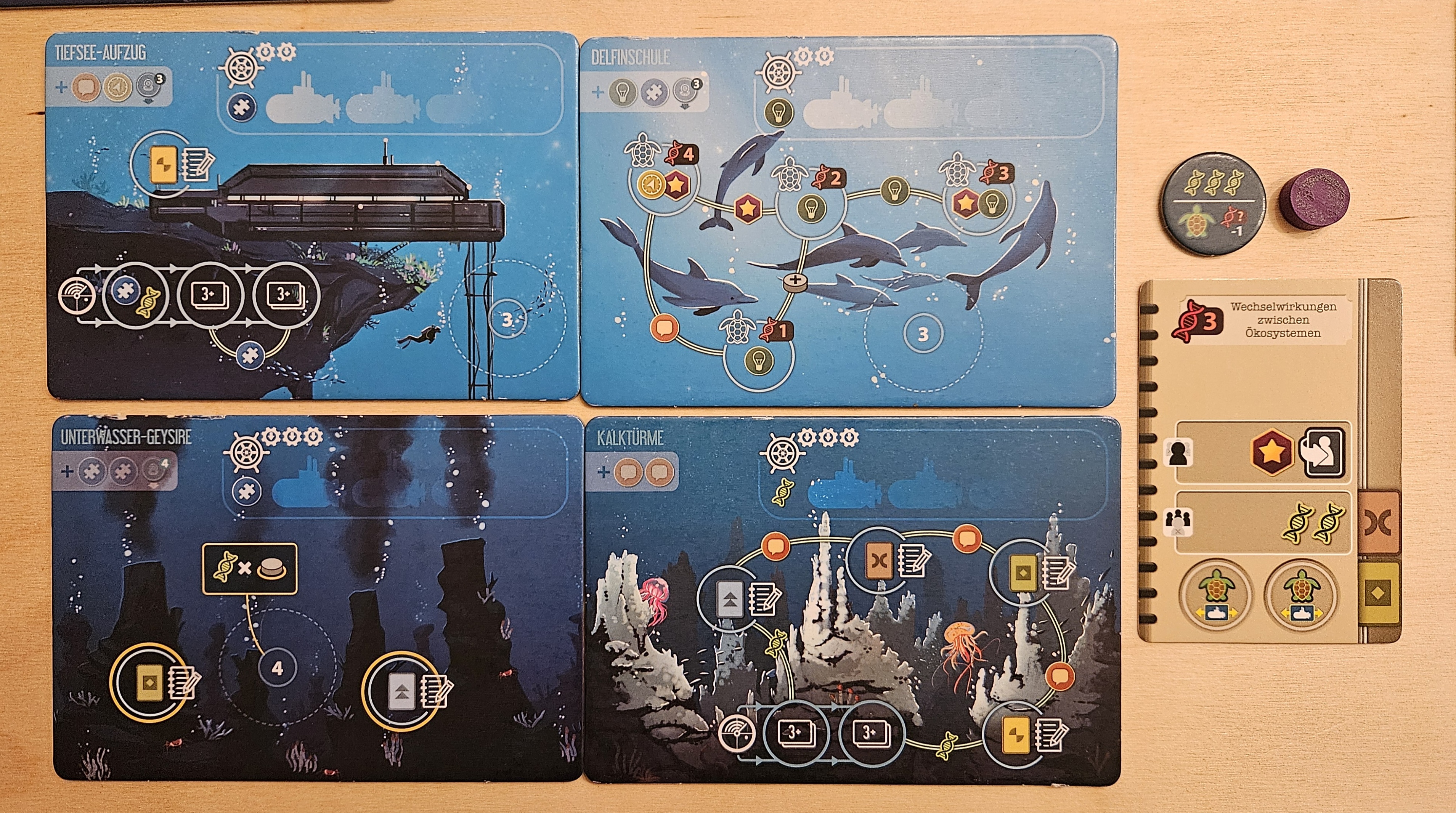 Argonauten kümmern sich bei den Schildkröten erneut um Meeresschutz. -2 Wissen und zwei Tafeln Tiefe 2 aufgedeckt. Der Einflussmarker wandert auf +1 Scheibe (und +1 SP). Durch die Versorgungskapseln in Spalte B erhalten sie +1 Organisation und +1 Genialität.