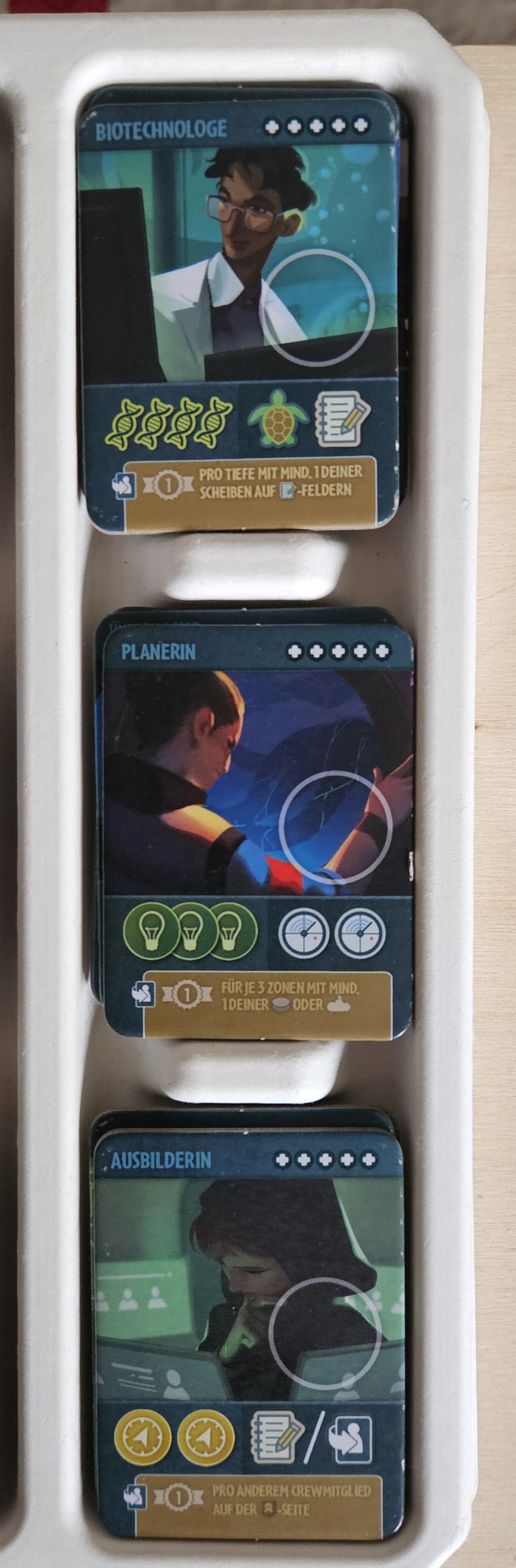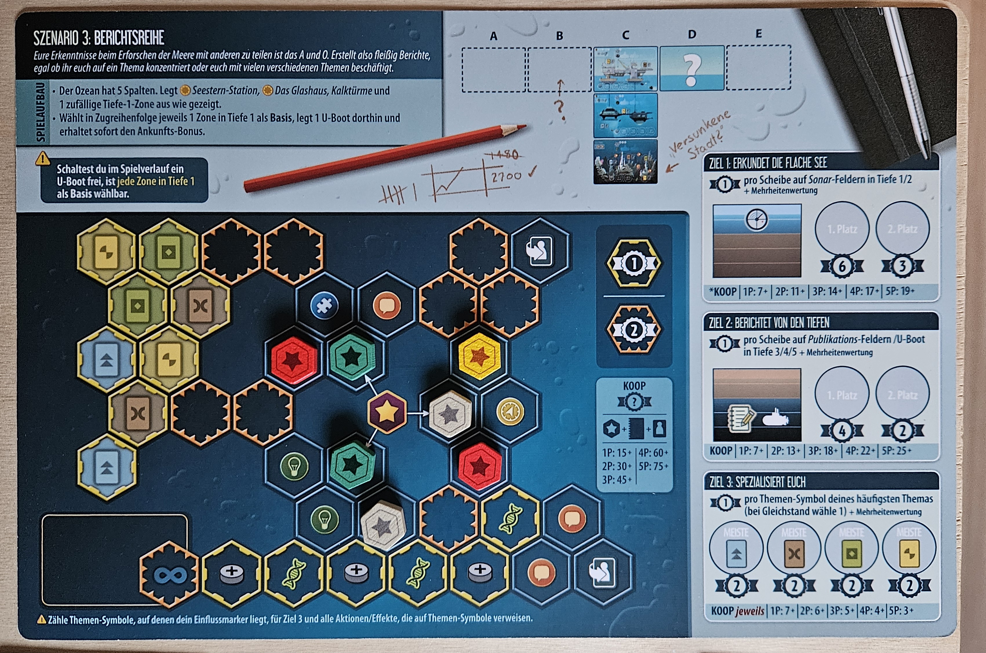 Die Riff-Ranger schicken ein paar Versorgungskapseln in die Tiefe (Spalte D) und erhalten +1 Organisation und +1 Genialität. Dadurch erhalten auch sie ihr zweites U-Boot, welches an der Seestern-Station ankert. +1 Scheibe