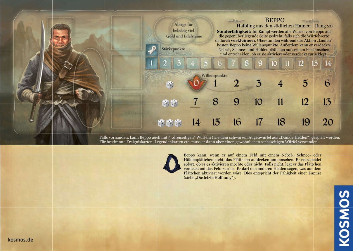 Anmerkung: Der Halbling hat eine zweite Sonderfähigkeit. Er muss nur die Hälfte an Proviant abgeben: Wenn er bei Sonnenaufgang Proviant (Apfelnüsse oder Sternkraut) abgeben kann oder auf dem Feld mit dem Lager/Trosswagen steht, erhält er 1 Sternchen, welches er bei einem späteren Sonnenaufgang als „halben Proviant“ abgeben kann. Nur der Halbling kann Sternchen tragen und bei Sonnenaufgang abgeben.