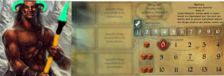 Garnos kann in einem Kampf ein Zauberbuch aufdecken, den Bonus dieses zauberbuches erhält er den kompletten Kampf. Nach dem Kampf ist das Zauberbuch verbraucht und Garnos kann es an diesem Tag nicht mehr einsetzen. Garnos darf pro Kampf nur ein Zauberbuch einsetzen. Am morgen werden die Zauberbücher neu gemischt und verdeckt wieder auf garnos Heldentafel gelegt.