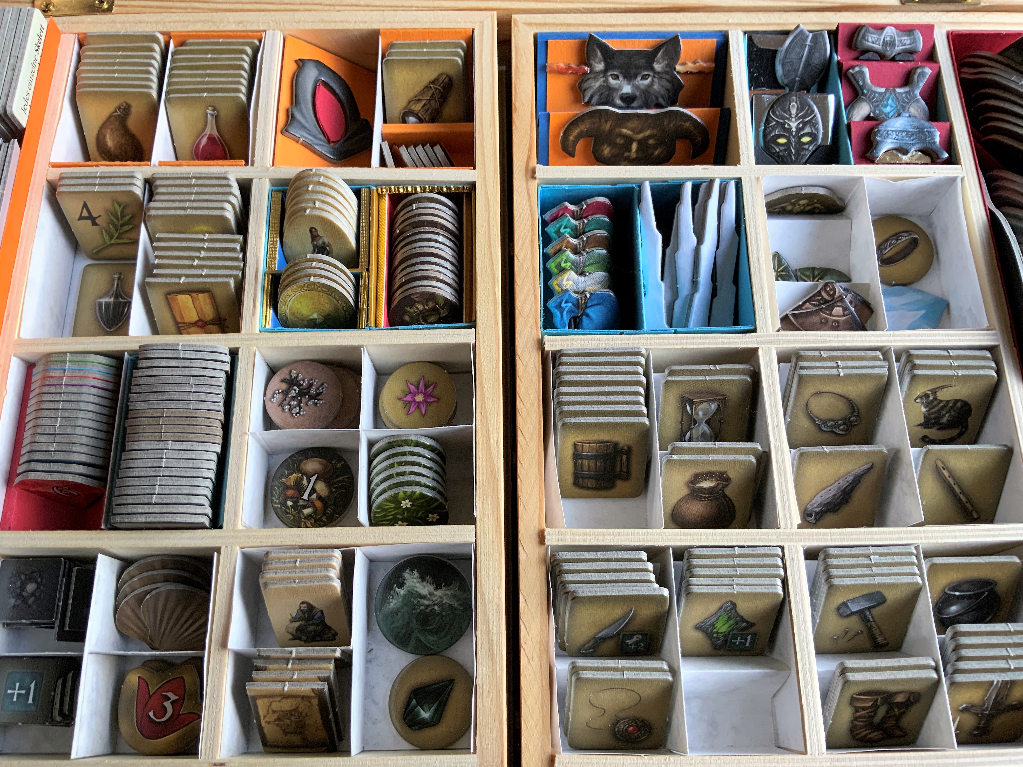 - Darin sind unter anderem auch Kästchen für die je zusammengehörigen Würfel, Plättchen und Steine.
