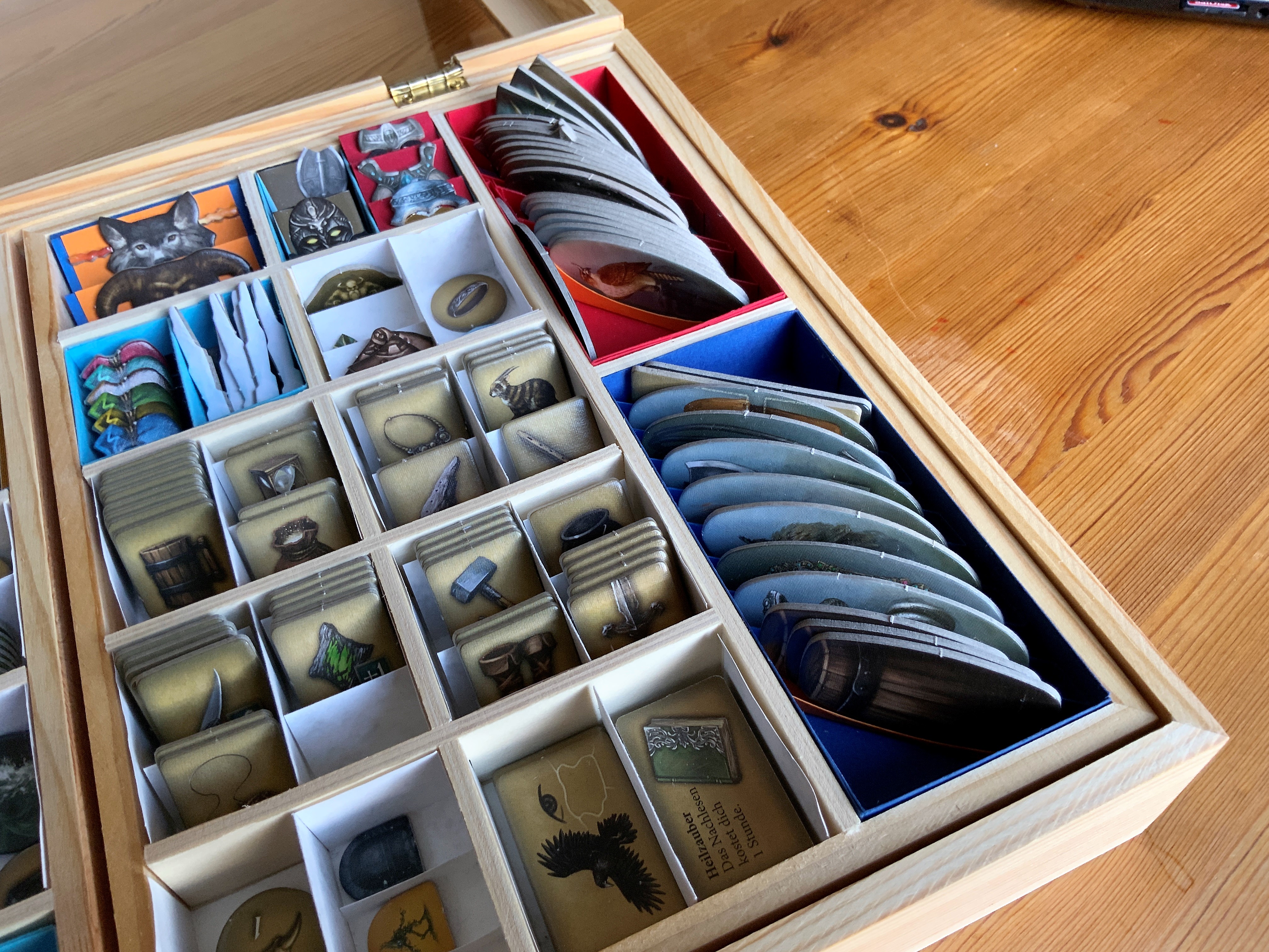- Die Bonusbox als Bewahrer der Helden. Die großformatigen Heldentafeln von Thorn und Bragor sind unter den übrigen untergebracht, die meisten Heldenfiguren liegen griffbereit, die Zwerge können in dieser flacheren Box aufrecht stehen; außerdem sind hier die Begleiter der Helden versammelt.