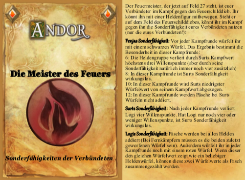 Derweil trafen die anderen Helden sich auf Feld 13. Barz erhielt einen weiteren TS und schaffte es nun, in einem Zug Feld 10 zu erreichen. Er übergab den Feuerschild an den Feuergeist. Dieser zeigte sich als wahrer Feuermeister. Denn er heilte nicht nur die Verbrennungen des Helden, sondern schaffte es auch, über die Feuerschildverbindung den Baum der Lieder fernzuentzünden. Dem sofort herbeieilenden Eisdämon gelang es leider nicht, dieses Feuer zu löschen, woraufhin die Bewahrer nach den "Helden von Andor" riefen (s.o.).
