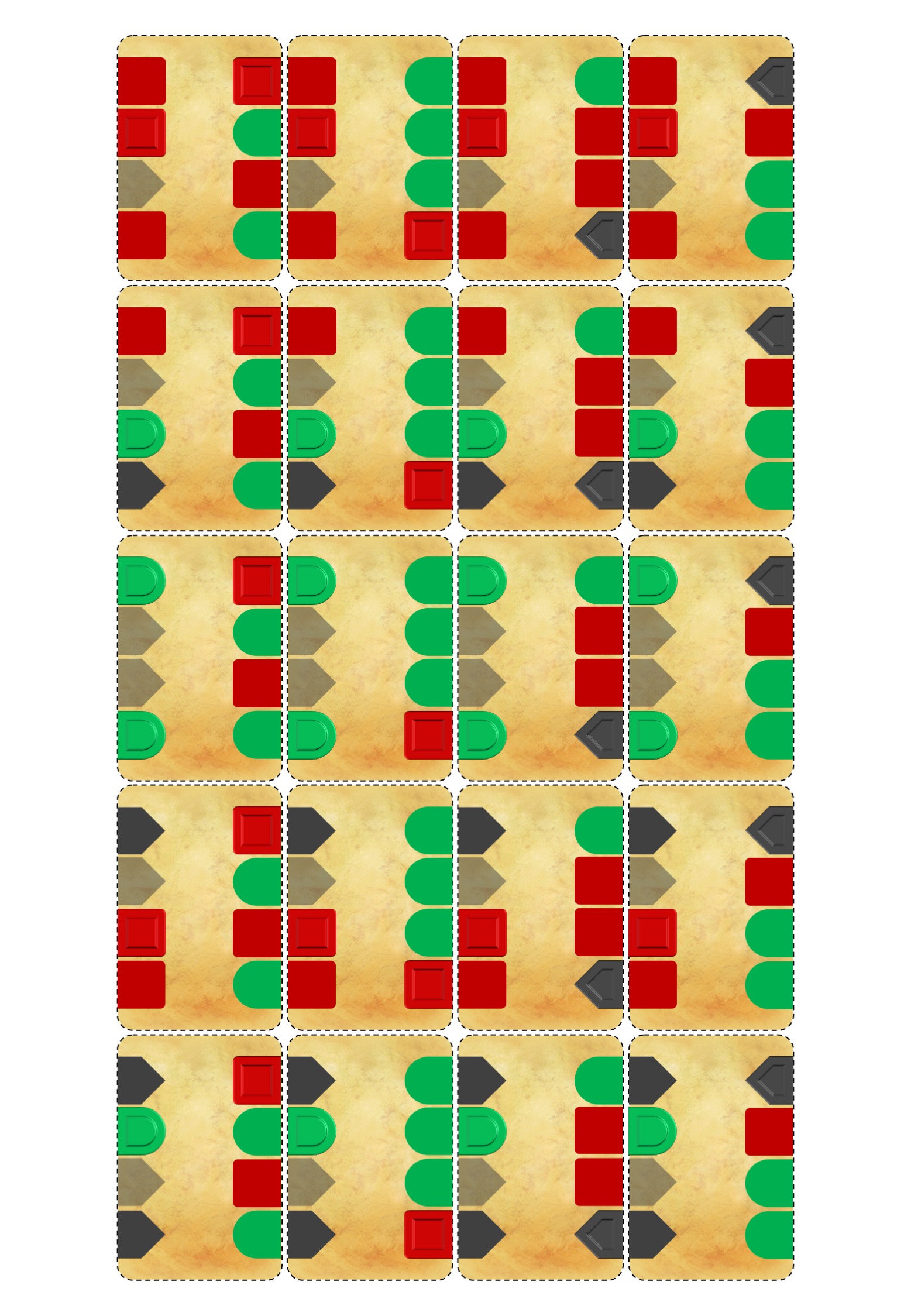 Aber, da es nun 2 verschiedene Karten gibt, die links rot-rot-schwarz-rot und rechts grün-grün-grün-rot sind, gibt es für ein bestimmtes oberstes linkes flaches Halbsymbol auf einer bestimmten dieser Karten bloß 10 Kombinationsmöglichkeiten (die 2x5 Karten in der ersten Zeile des Blanko-Kartenarrangements).