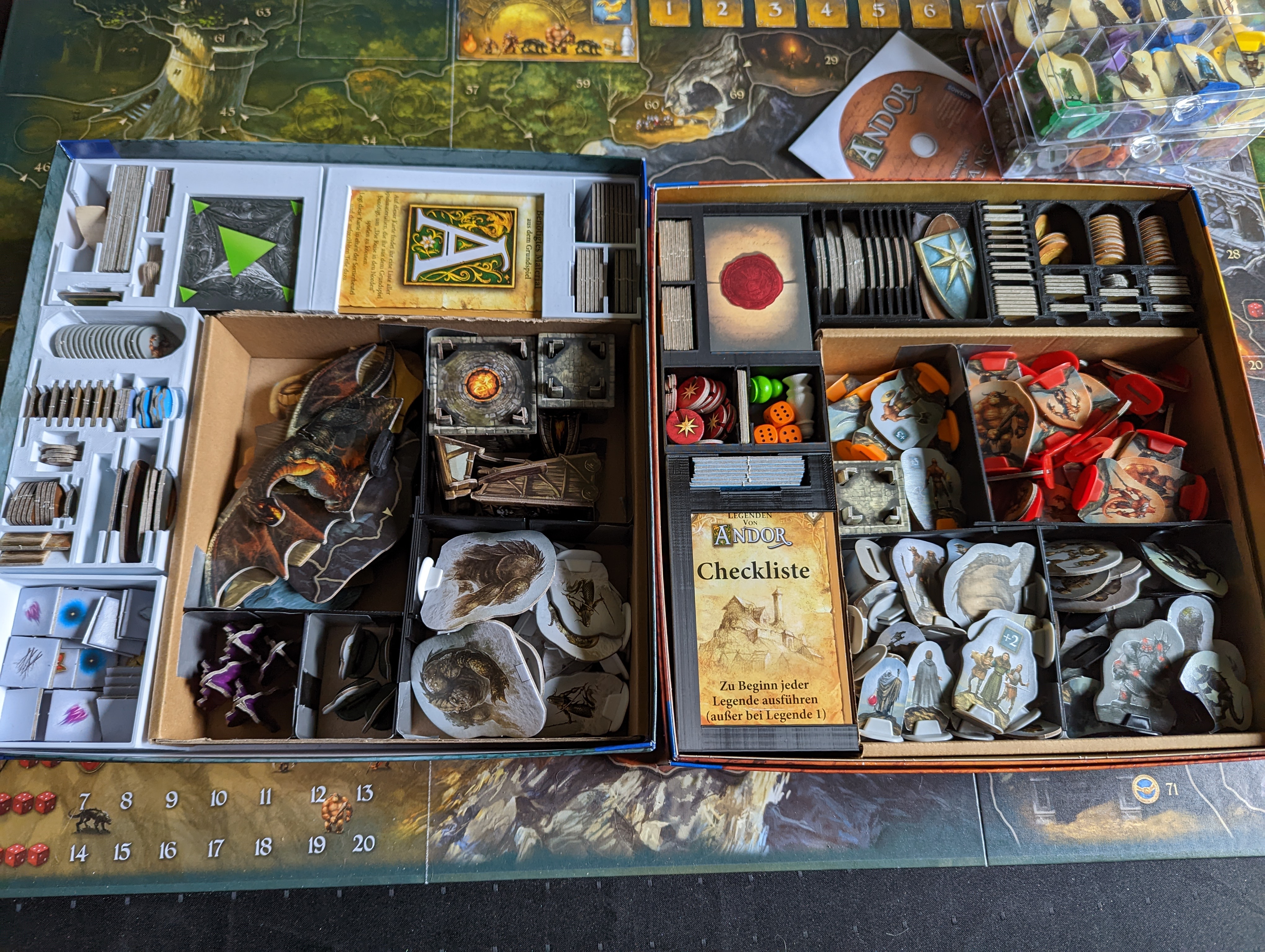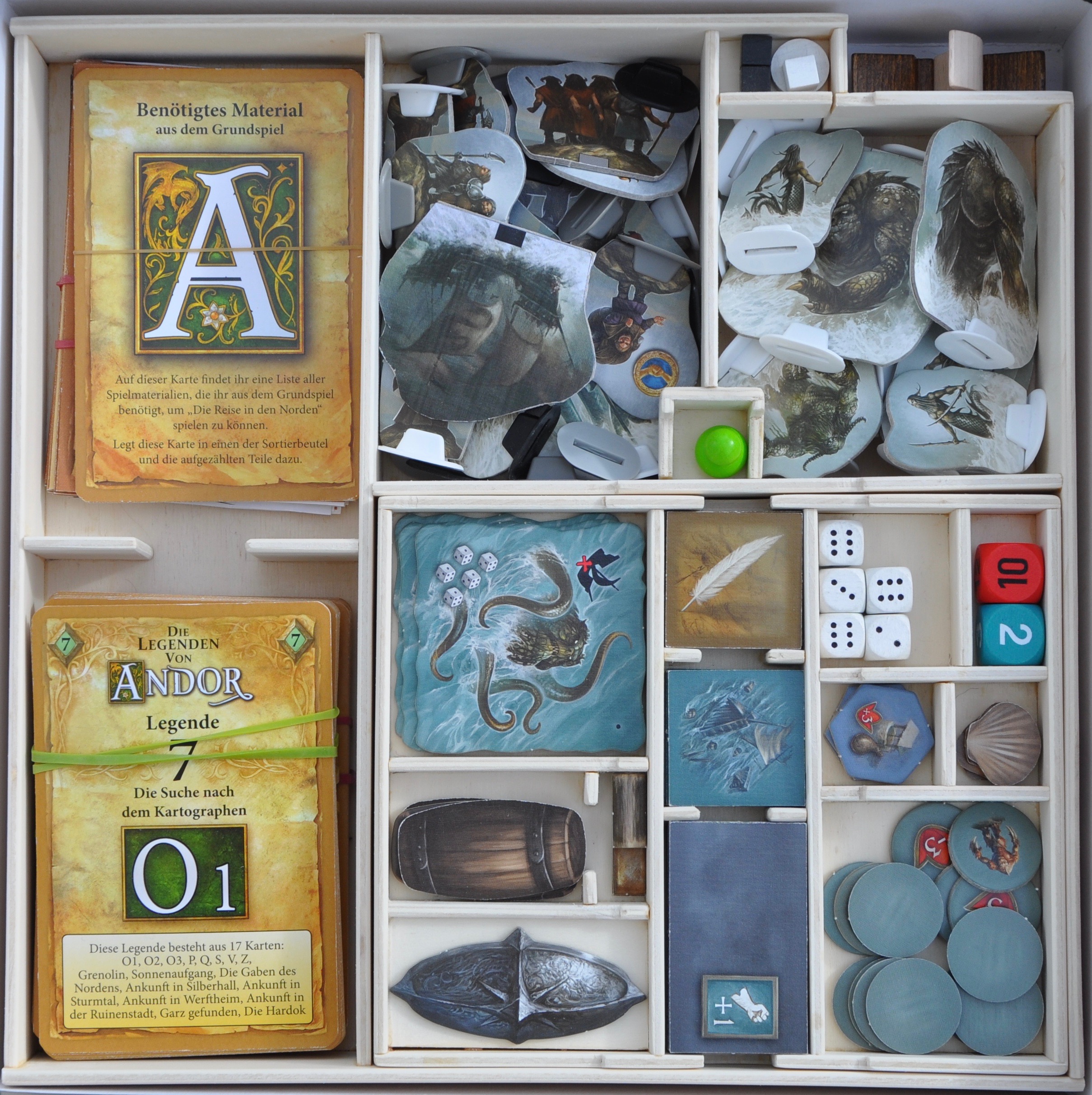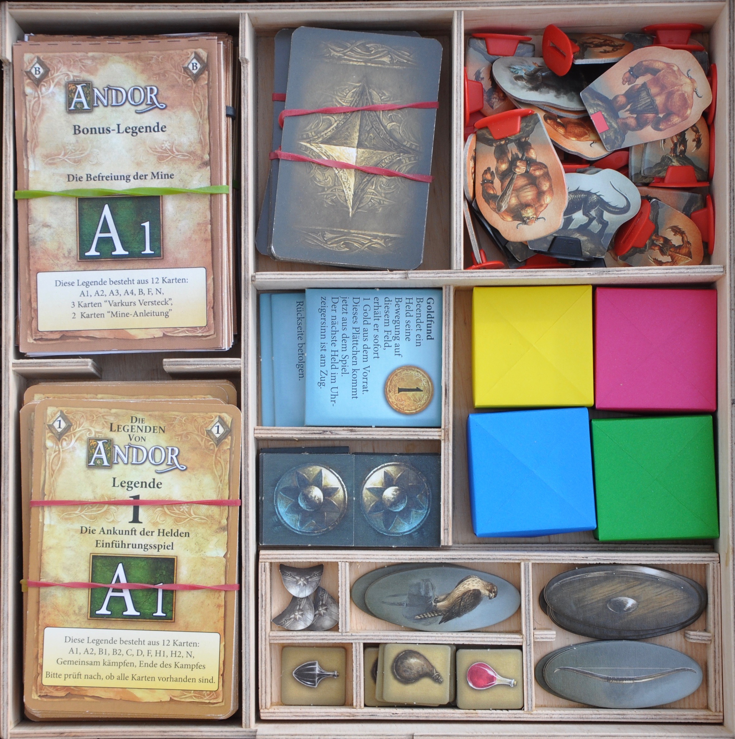 schon seit längerem beschäftige ich mich mit der Frage, wie ich meine Andor-Teile am besten sortiere. Deshalb habe ich jetzt ein Inlay für das Grundspiel und für die Reise in den Norden aus Holz gebaut, und weil ich kein passendes Thema gefunden habe, eröffne ich jetzt einfach ein neues. Vielleicht hat ja jemand ein ähnliches Vorhaben wie ich und kann die Bilder als Inspiration nutzen.