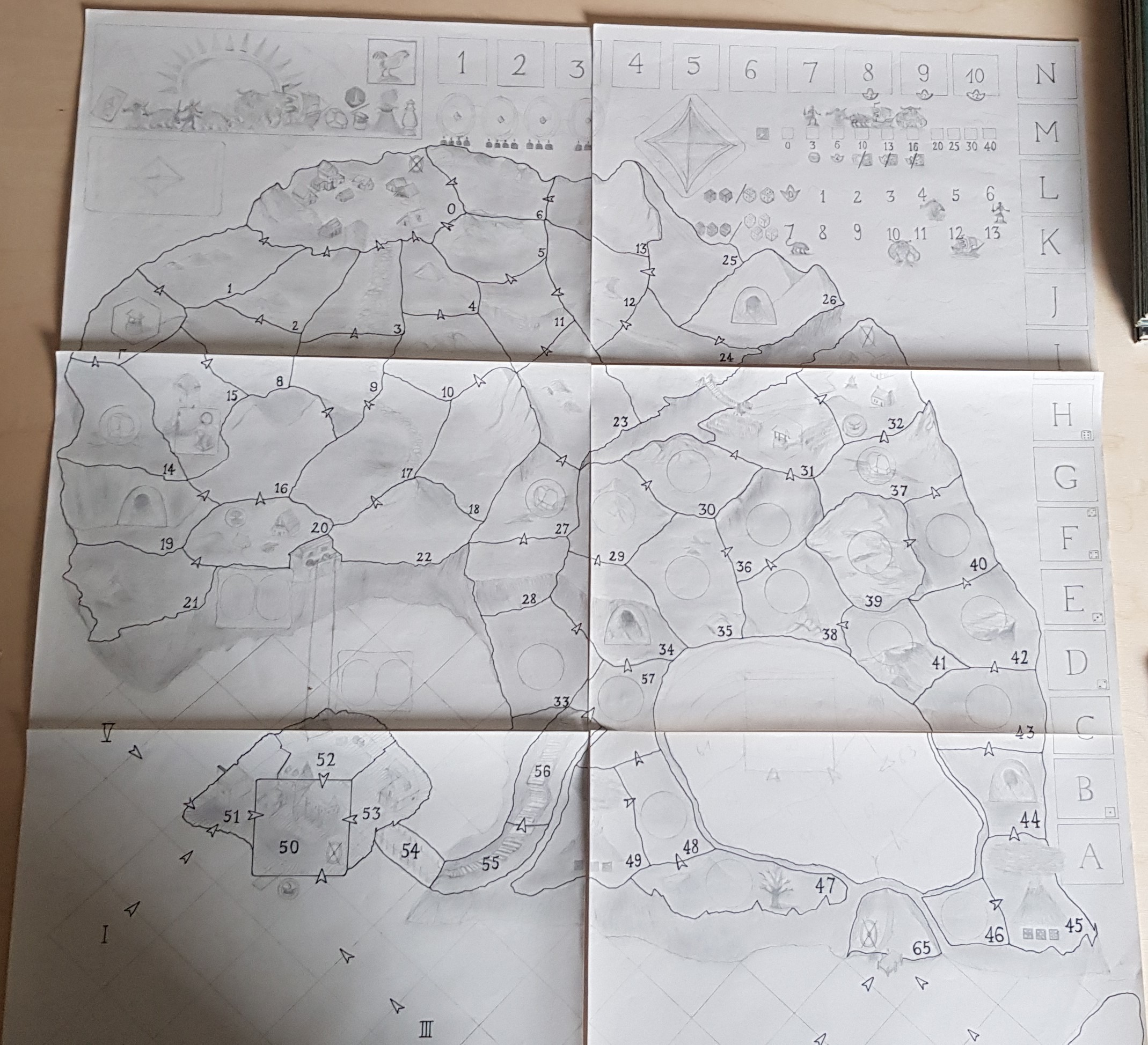 Auch wenn er noch nicht ganz vollendet ist, wollte ich schon mal den Gesamtspielplan zeigen. Sobald die Zeichnung fertig ist, wird der Spielplan noch eingescannt und evtl. auch noch mit etwas Farbe versehen. Letzteres allerdings bin ich noch am Überlegen.