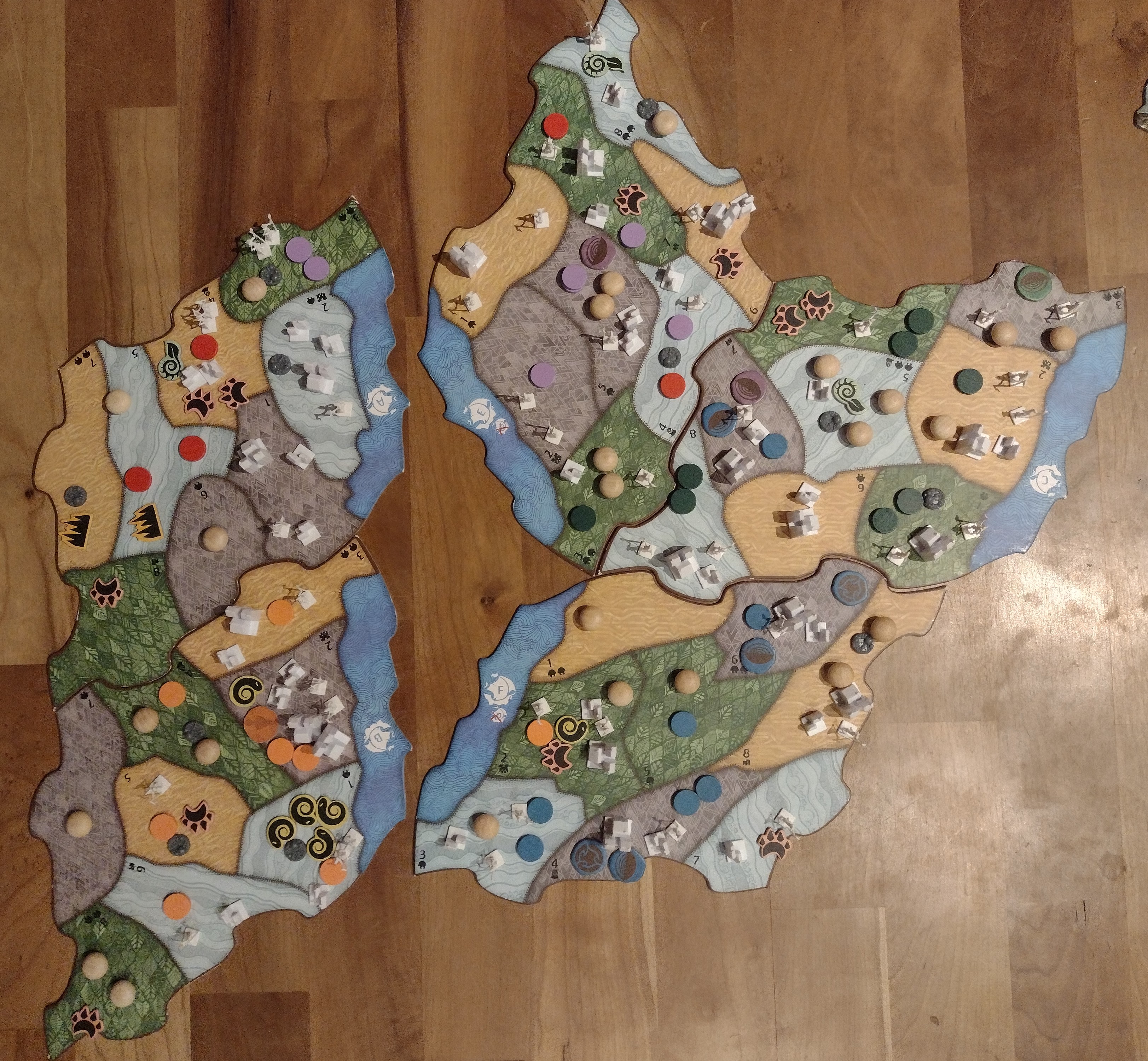Ich habe jetzt 8 Energie (1 von der langsamen Phase, 1 vom Wachstum, 1 von der Leiste) und kann 4 Karten spielen. Da wäre: Elementarer Schrim auf E5 (E2 lasse ich veröden, um Präsenz loszuwerden). Tsunami. Erwachen der Bäume und Steine, Gabe der Macht.