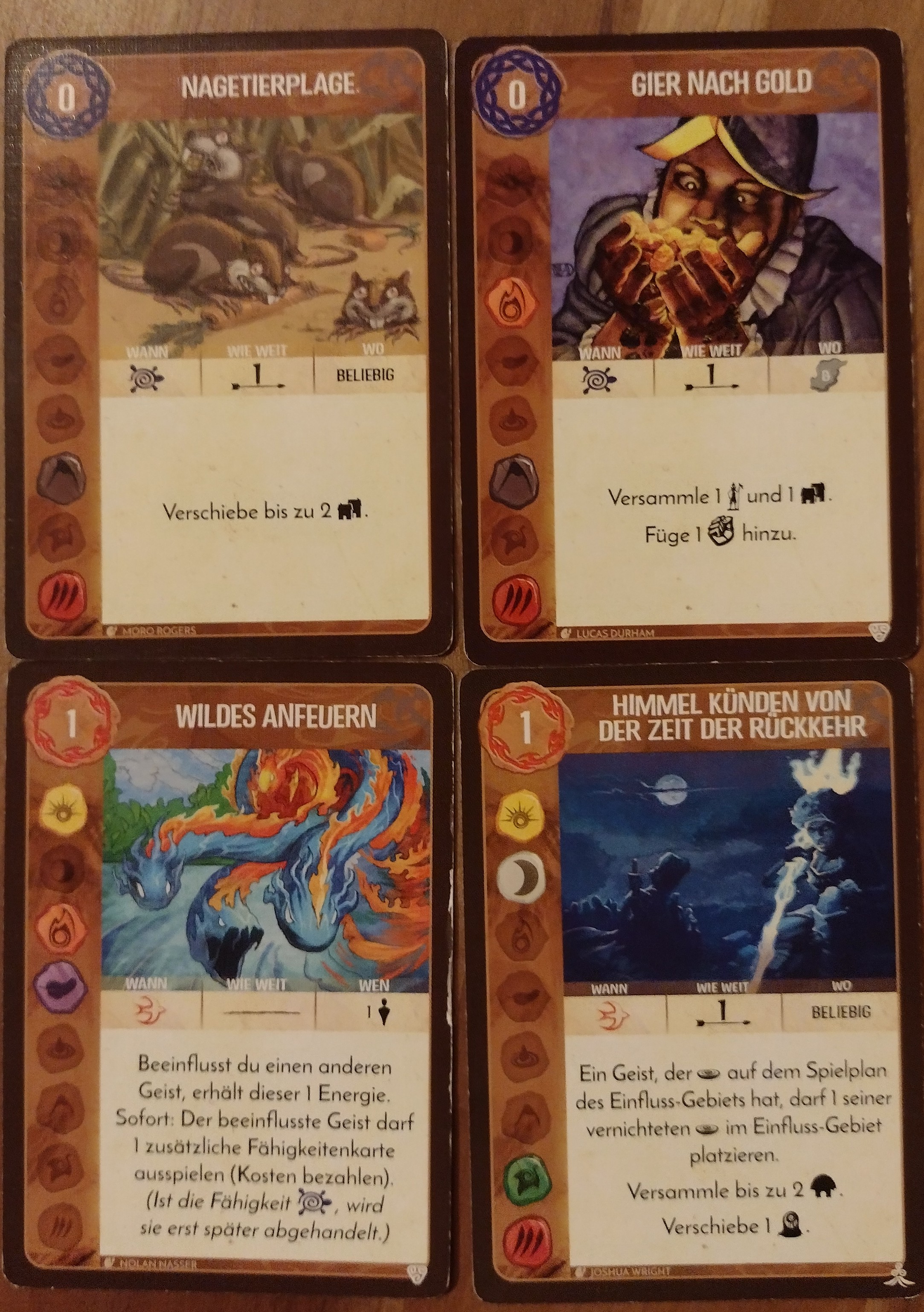 Ich habe jetzt 8 Energie (1 von der langsamen Phase, 1 vom Wachstum, 1 von der Leiste) und kann 4 Karten spielen. Da wäre: Elementarer Schrim auf E5 (E2 lasse ich veröden, um Präsenz loszuwerden). Tsunami. Erwachen der Bäume und Steine, Gabe der Macht.