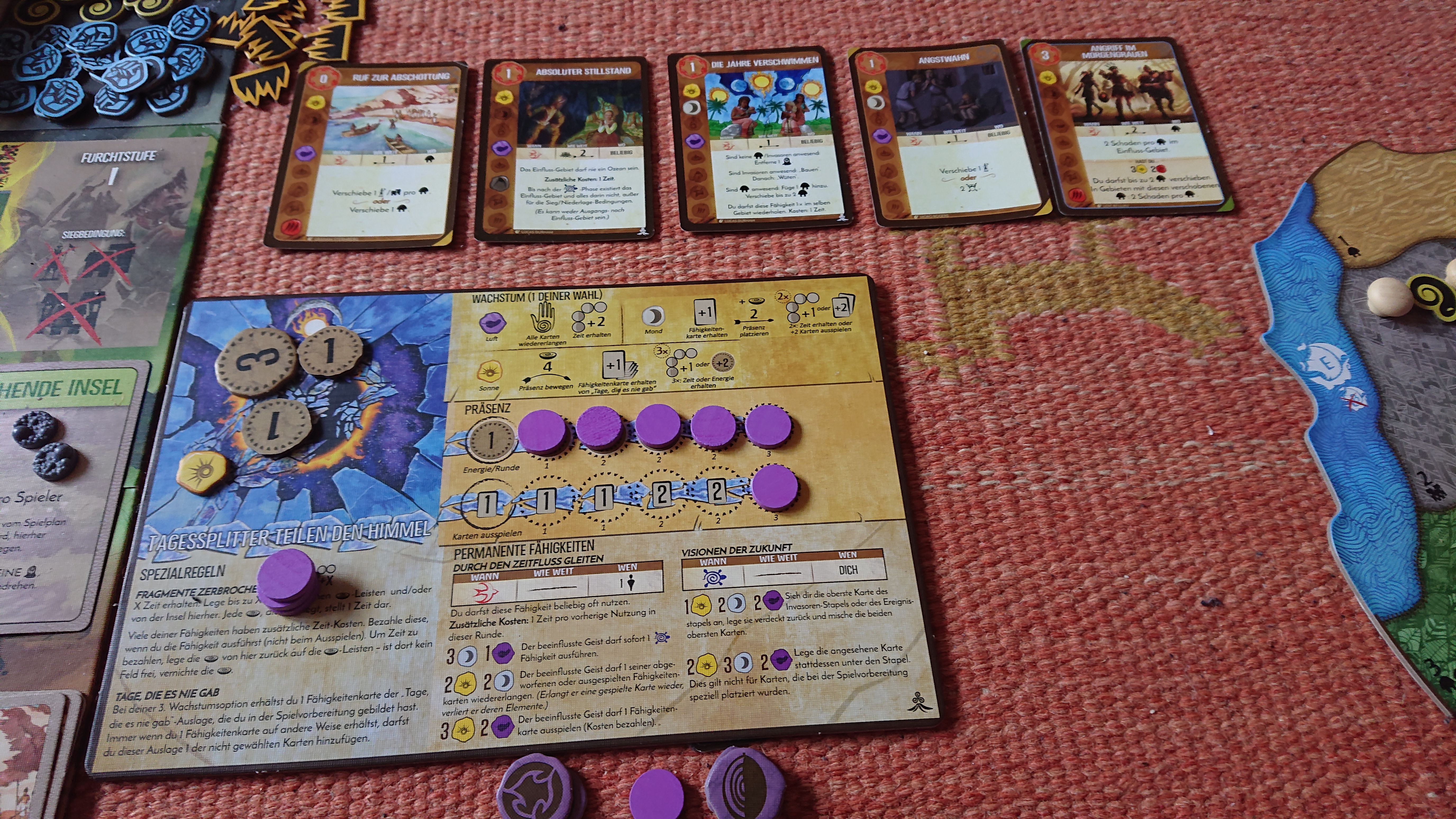Erste FK: Vorahnung. Nett und verhinderte in 2 Gebieten potentiell Ödnis. Blieben halt noch 6 andere Gebiete, die ich nicht verteidigen hatte können bei 3 verbliebenen Ödnismarkern.