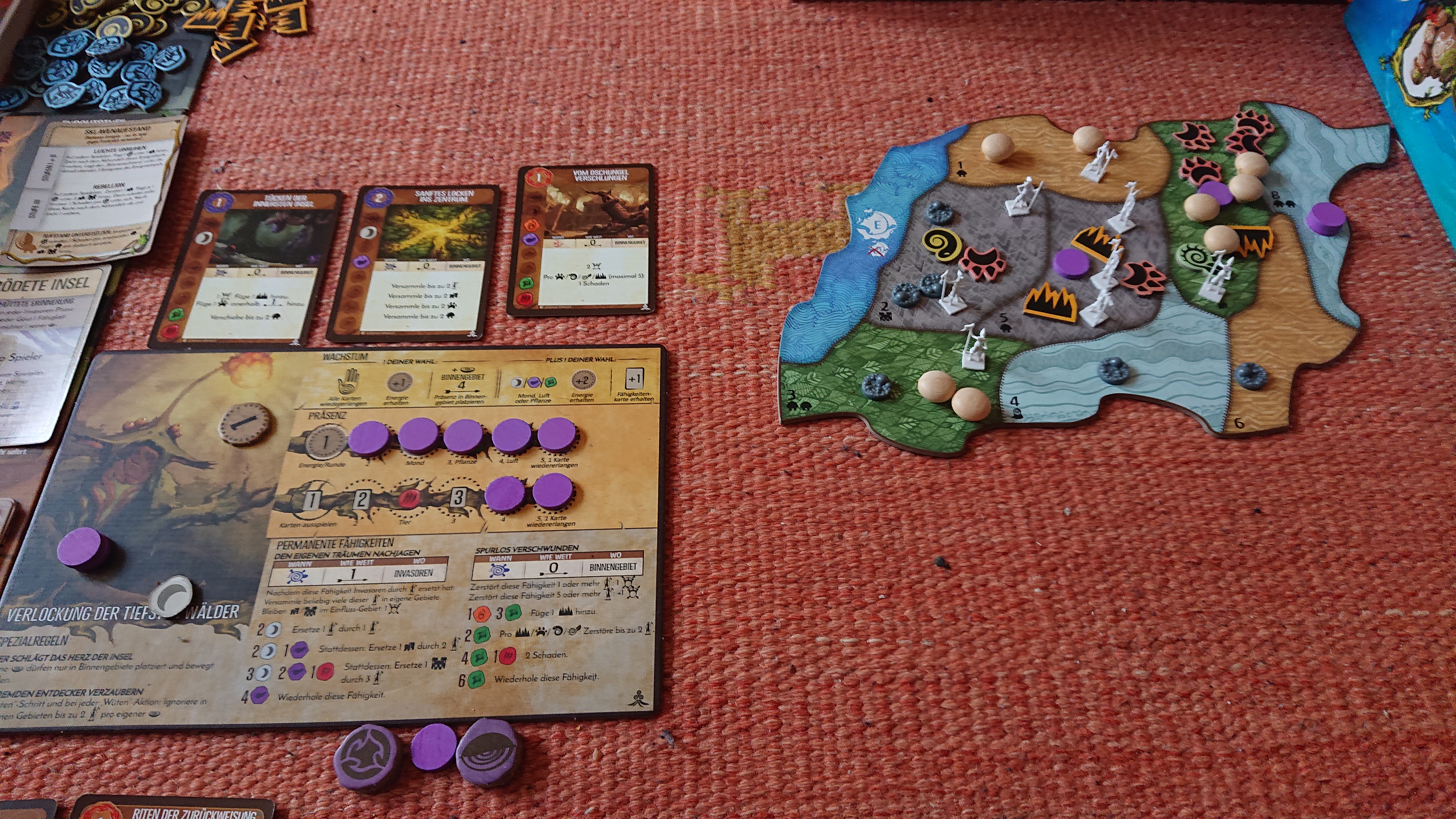Wegen dieses Energieproblems konnte ich keine StF mehr spielen, mein Fokus lag also auf SchwF. Ich hatte sowieso schon einiges an Entdeckerbewegung und konnte auch Willdnis hinzufügen, weshalb im Innland nie ernsthaft gebaut wurde und auch kaum Entdecker dazu kamen (außer in meinem grandiosem Küstendschungel). So verlor ich zwar nicht (wobei nur noch eine Ödnis auf der verödeten-Insel-Karte lag, es war also knapp, extrem knapp), ich gewann aber auch nicht. Bis ich eine SchwF fand, die EINÖDEN (und Seuchen) hinzufügte! Perfekt, da meine linke Elementefähigkeit grandios mit Einöden synergiert (jede Wiederholung gleich eine Aktion, d.h. ein Extraschaden). Ich platzierte Einöden in beide Dschungel und zerstörte in 3 Runden alle Gebäude. Furchtstufe 2 Sieg!