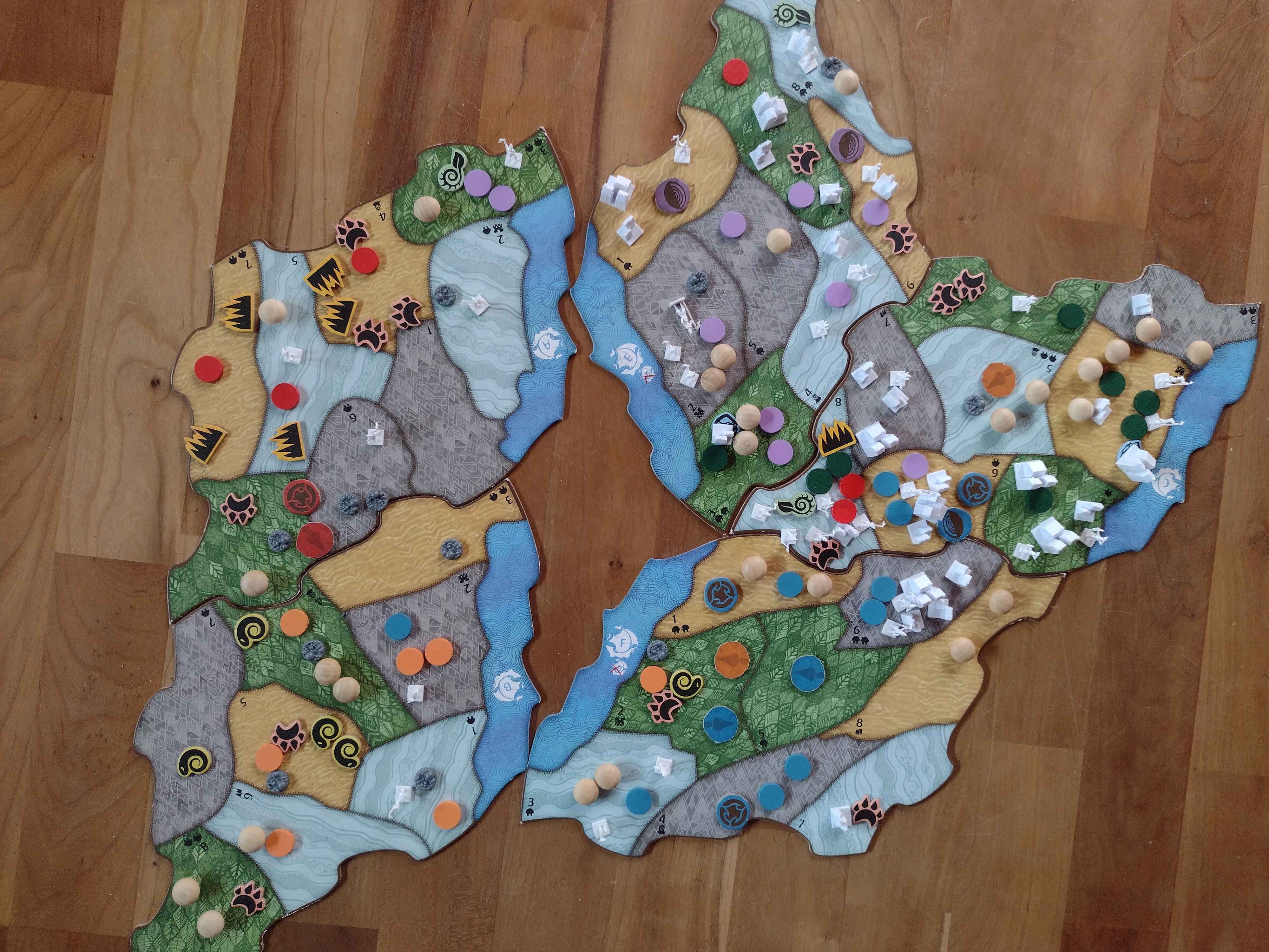 In C6 und F6 sind jeweils 2 Präsenzen von mir, d.h. beide Gebiete zählen auch als Sumpf und die Dörfer und Städte haben -1 Abwehrkraft durch meine Schlammlawinen und -1 Abwehrkraft durch das Ereignis, sodass die Versinkenden Fundamente reichen, um mit je einen Schaden auf alle Dörfer und Städte dort auch alle Dörfer und Städte zu zerstören. Die Entdecker bleiben zwar stehen, stören aber nicht.