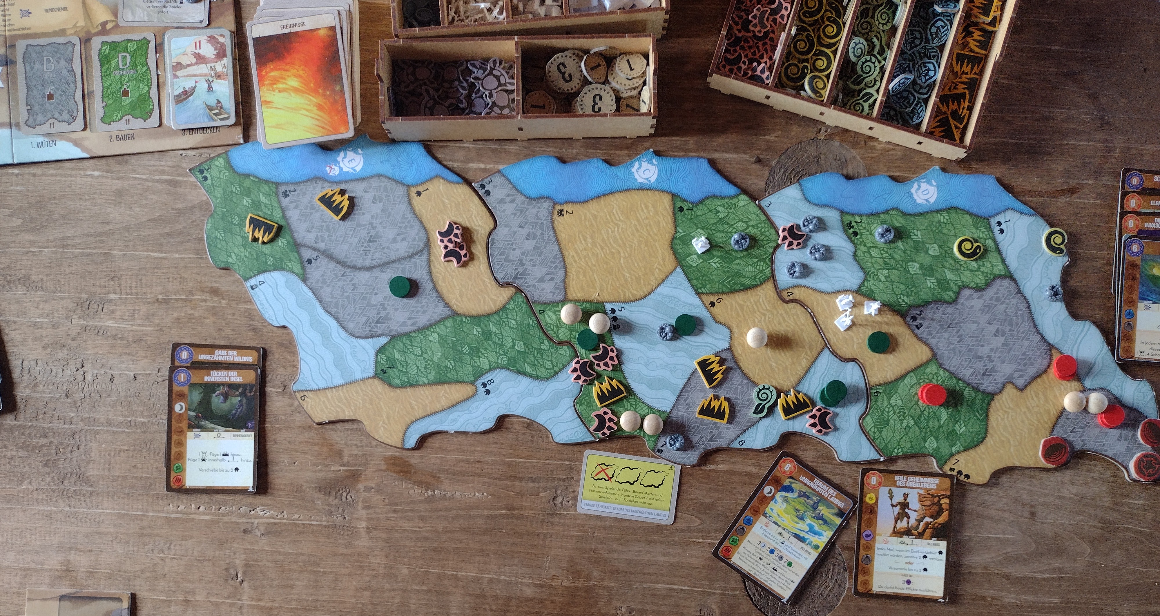 War ein wirklich interessantes Spiel, wenn auch nicht sonderlich spannend: Relativ früh erhob das Urgedächtnis einen vergessenen Inselspielplan aus den Fluten des Ozeans und als die Invasoren dann zufälligerweise immer die Gebiete, in denen auf dem Spielplan Wildnis lag, erkundeten, war das Spiel so gut wie gewonnen, da die Invasoren in den heiklen Gebieten, Sumpf und Dschungel, auch auf den anderen Plänen somit nicht mehr wirklich zum Bauen kamen...
