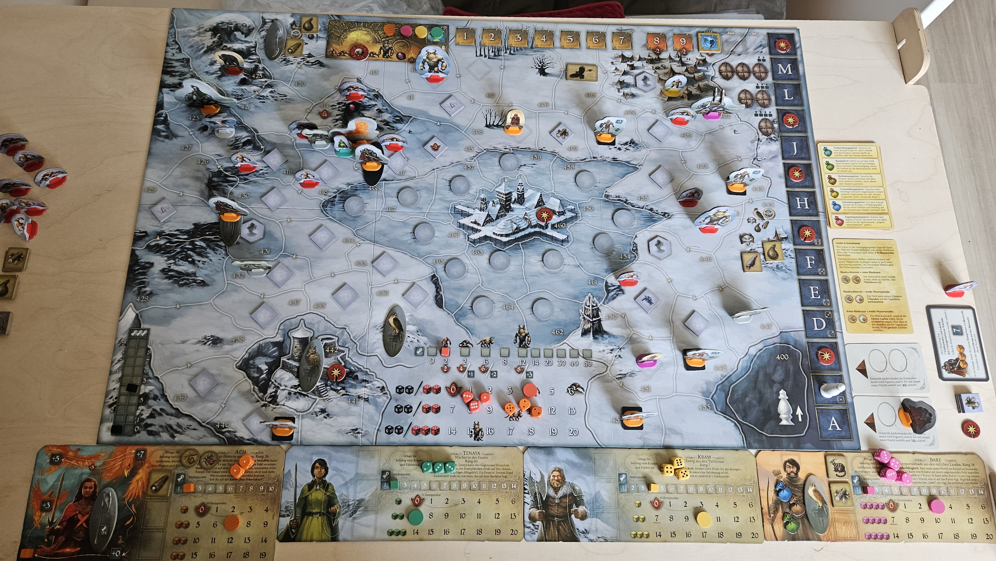 - Barz wanderte bis zum Knochenturm auf Feld 450 (7.h) und rettete den Hornfalken vor den Wilderern. Mit dem Fernrohr erspähte er auf Feld 449 ebenfalls Blaubachbeeren und auf 451 Brennholz. Dann schickte er das Fernrohr an Kram, der von seinem Feld aus den Schnee absuchte: Auf den Feldern 408 und 411 sah er jeweils 1 Schneesturm und auf 412 1x rotes Blutkraut.