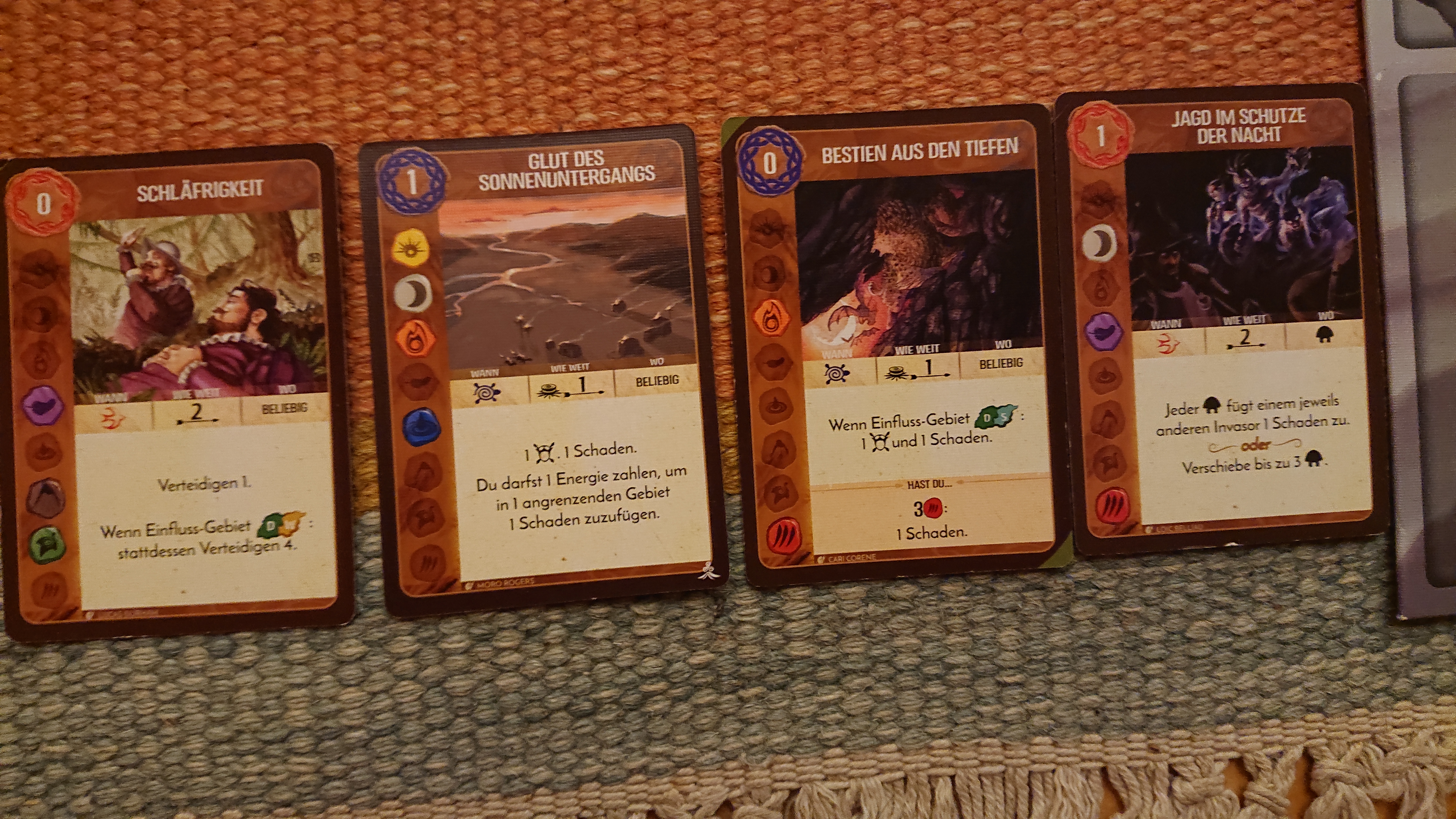 Als erstes: Nutztiere drehen durch, wird auf D7 gespielt. Das gibt 1 Furcht und Verteidigen 5. Das sollte für 1 Dorf und 1Stadt reichen. Den Rest erledigen die drei Dahan.