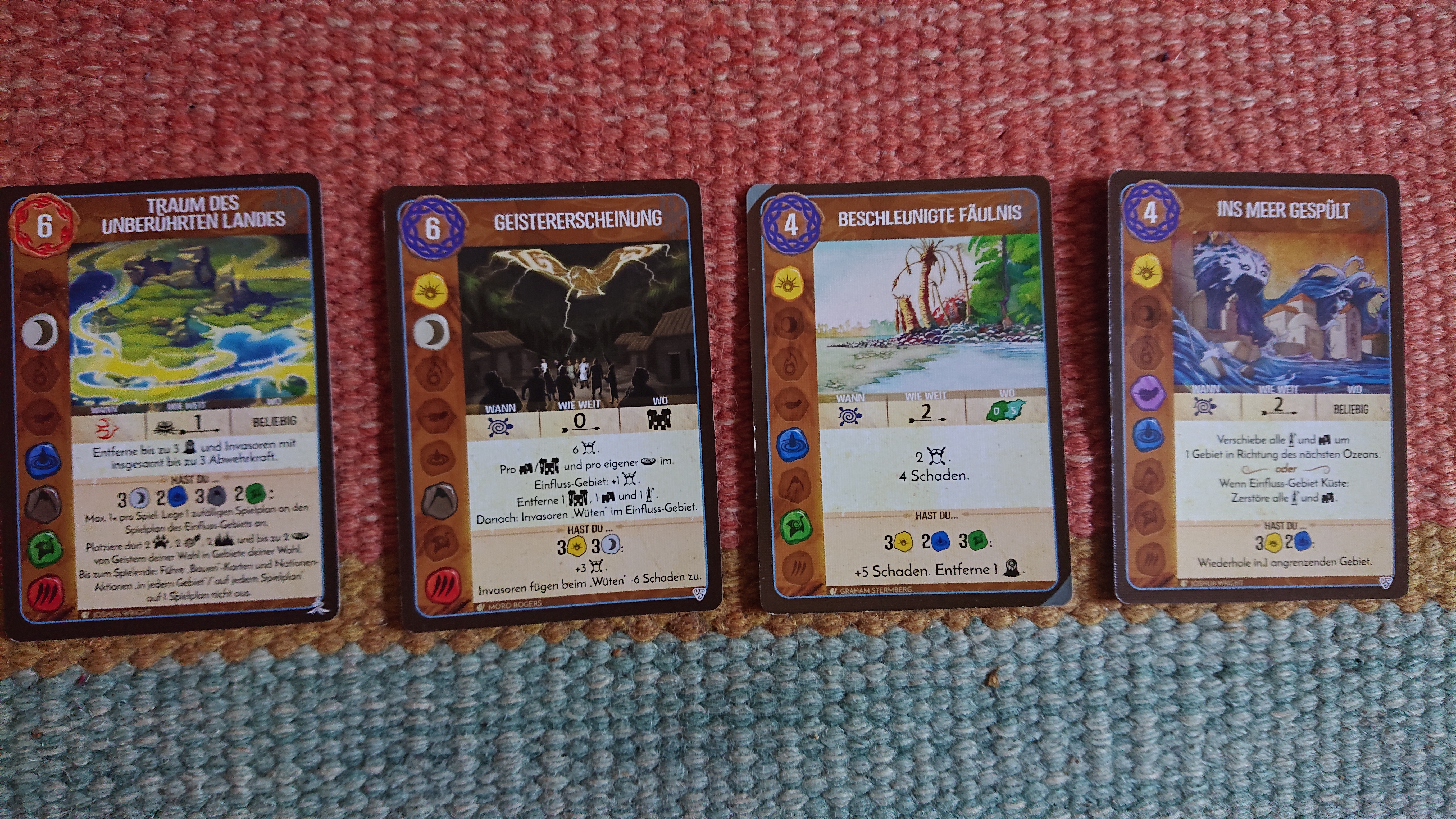 Als erstes: Nutztiere drehen durch, wird auf D7 gespielt. Das gibt 1 Furcht und Verteidigen 5. Das sollte für 1 Dorf und 1Stadt reichen. Den Rest erledigen die drei Dahan.